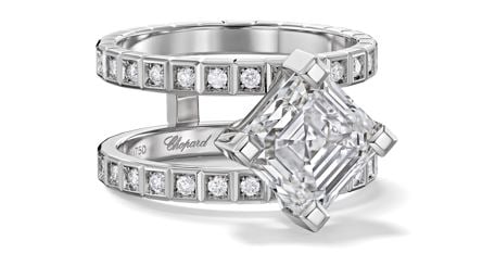 Característico del movimiento Art déco, el diamante talla Asscher encuentra una nueva expresión audaz a través de dos destacadas creaciones. Un anillo recupera un diseño emblemático de la colección con dos aros paralelos de oro blanco ético de 18 quilates engastado con brillantes, unidos por un diamante talla Asscher de 3 quilates colocado en diagonal.