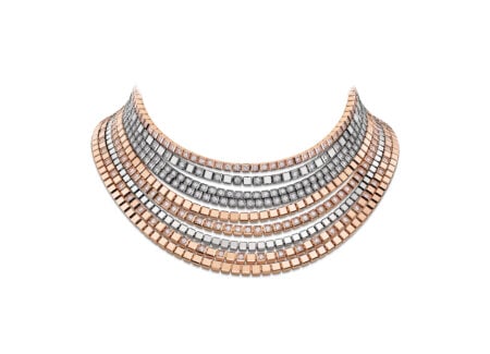 En el corazón de la colección se encuentra un collar transformable, único en su género, formado por unas hileras de cubos articulados de oro blanco y rosa ético. Un total de nueve hileras crean una silueta dinámica, se añaden o se retiran por grupos de tres según la ocasión.