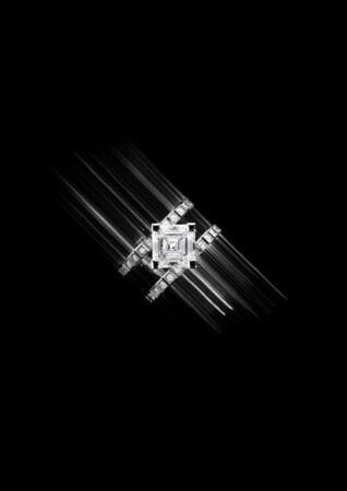 Característico del movimiento Art déco, el diamante talla Asscher encuentra una nueva expresión audaz a través de dos destacadas creaciones. Un anillo recupera un diseño emblemático de la colección con dos aros paralelos de oro blanco ético de 18 quilates engastado con brillantes, unidos por un diamante talla Asscher de 3 quilates colocado en diagonal.