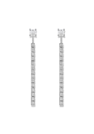Siguiendo la misma arquitectura, un par de aretes está formado por dos solitarios talla Asscher de 1,2 quilates, cada uno de ellos sujeto al otro lado de la oreja por una hilera fluida formada por 14 cubos engastados con diamantes. Este colgante se puede retirar en uno de los pendientes, o incluso de los dos.