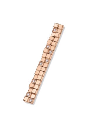 Elaborados con la misma atención meticulosa, tres nuevas pulseras se proponen en versiones de tres o de seis hileras de cubos de oro rosa o blanco ético, parcial o completamente engastados con diamantes. El alfiler, declinado en los mismos colores de oro y con unos acabados similares, es una joya unisex que ofrece una gran variedad de opciones para llevar. Está diseñado para colocar en la solapa, para utilizar como alfiler de corbata o incluso para llevar en el cabello.