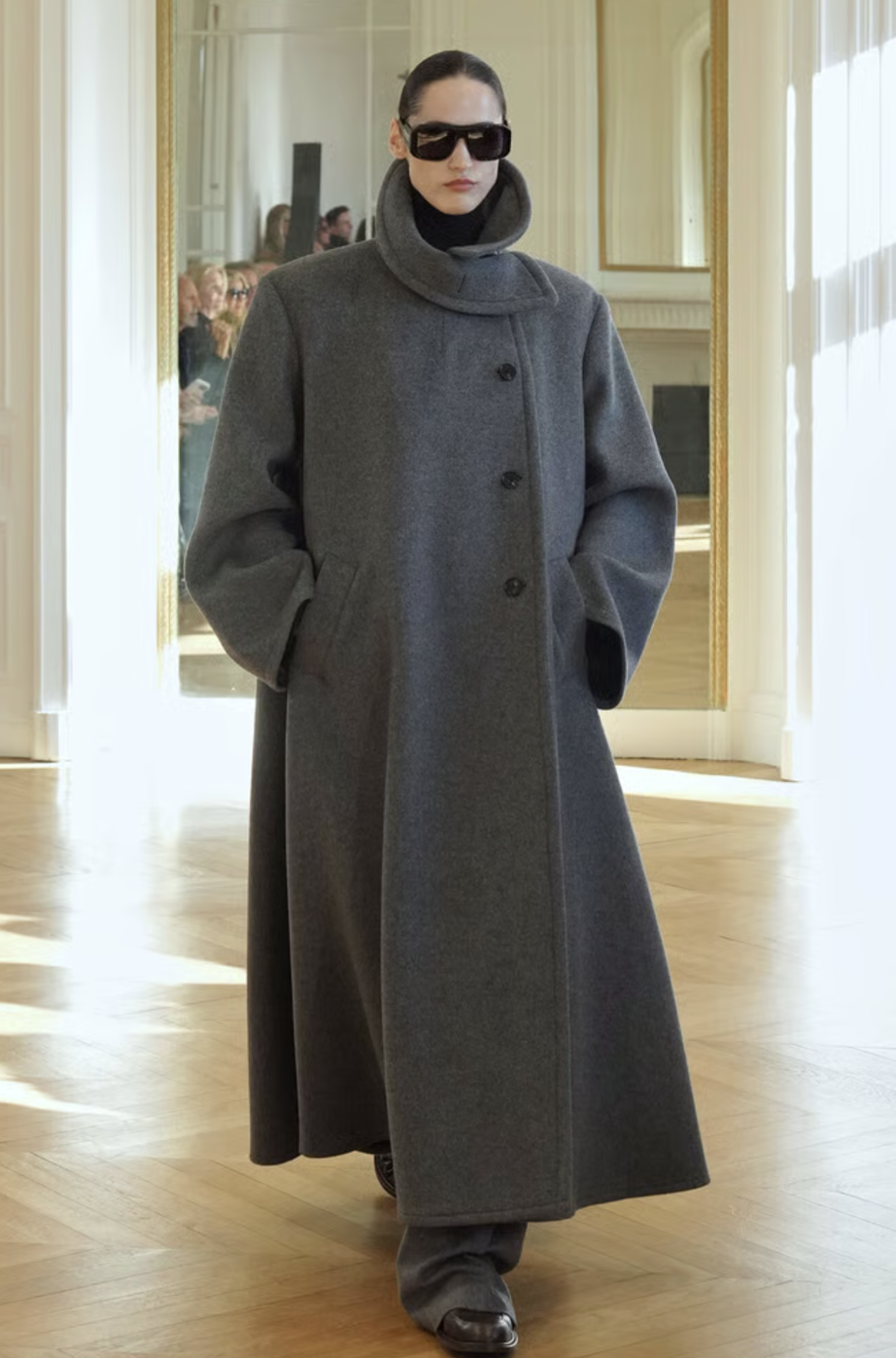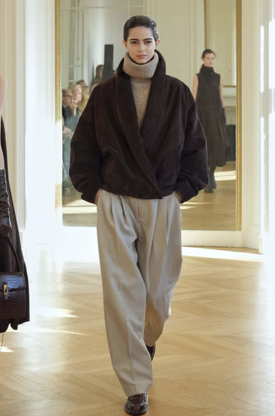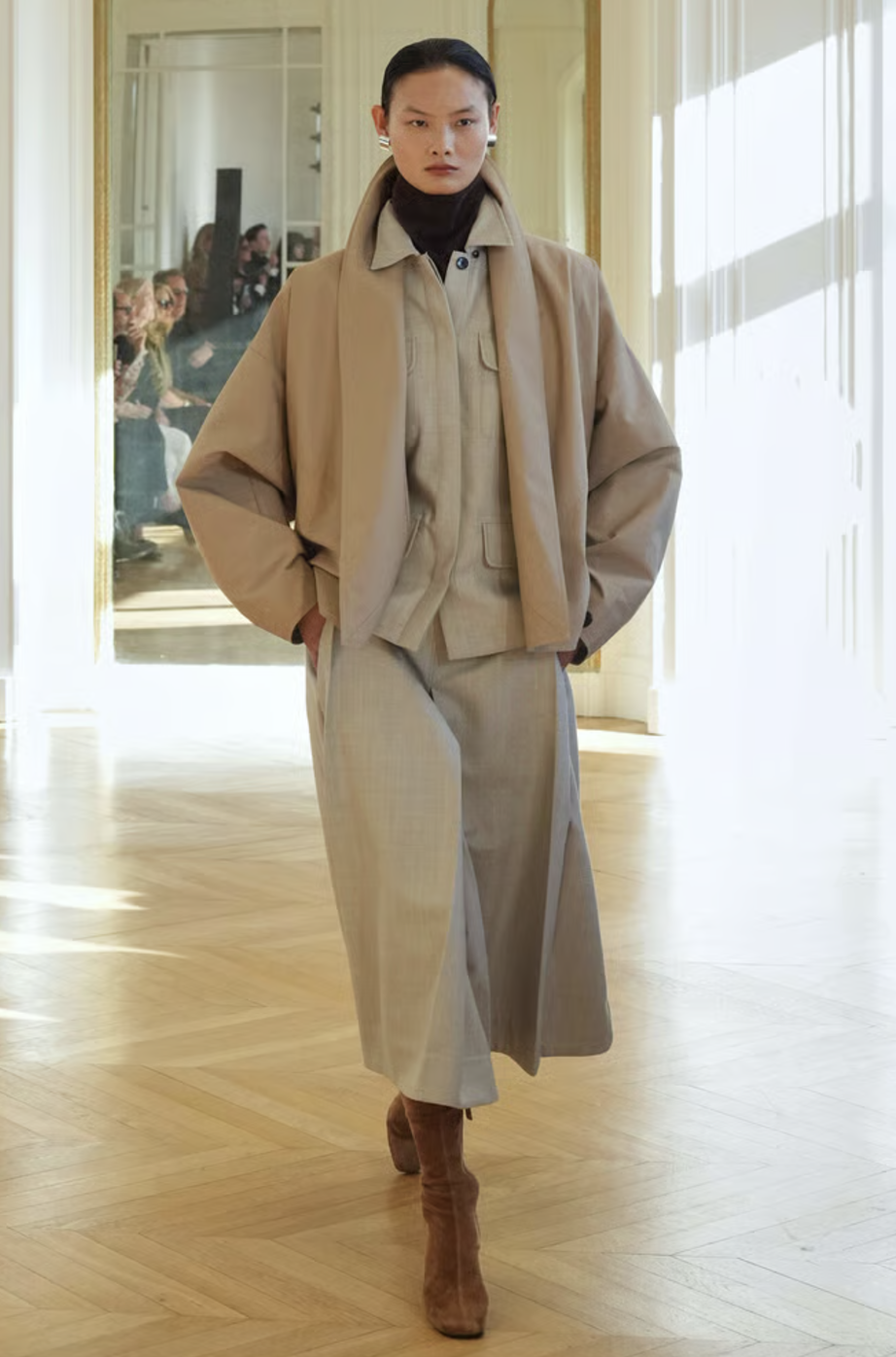 A medida que avanzaba la colección, las capas se convirtieron en el eje central. Abrigos de corte amplio, confeccionados en lanas suntuosas, se combinaban con piezas inferiores más ajustadas para jugar con las proporciones. La maestría de la marca reside en su capacidad para superponer texturas sin añadir peso visual, creando un efecto de profundidad que resulta fascinante. Es una oda al diseño funcional donde cada elemento tiene una razón de ser.