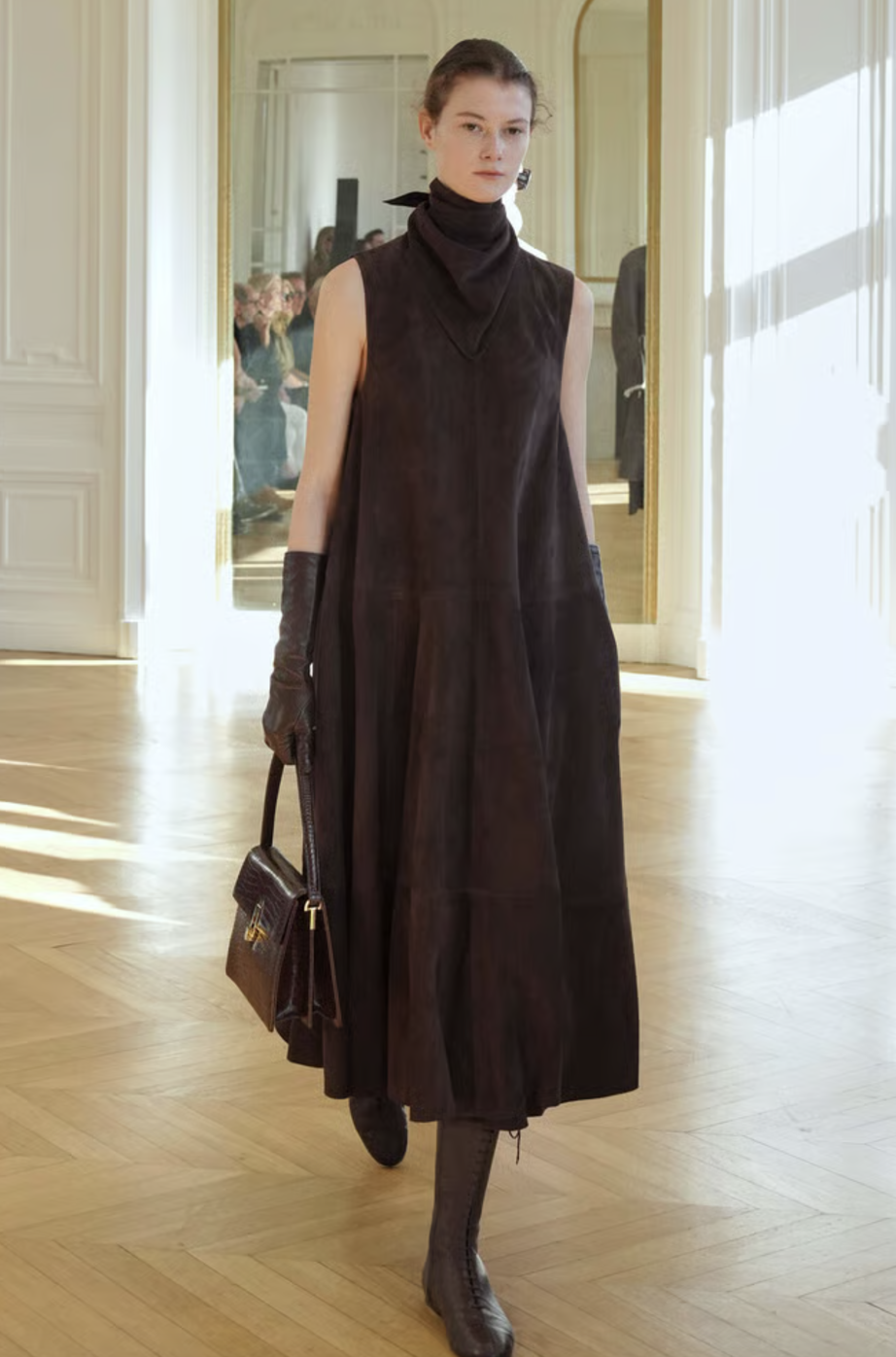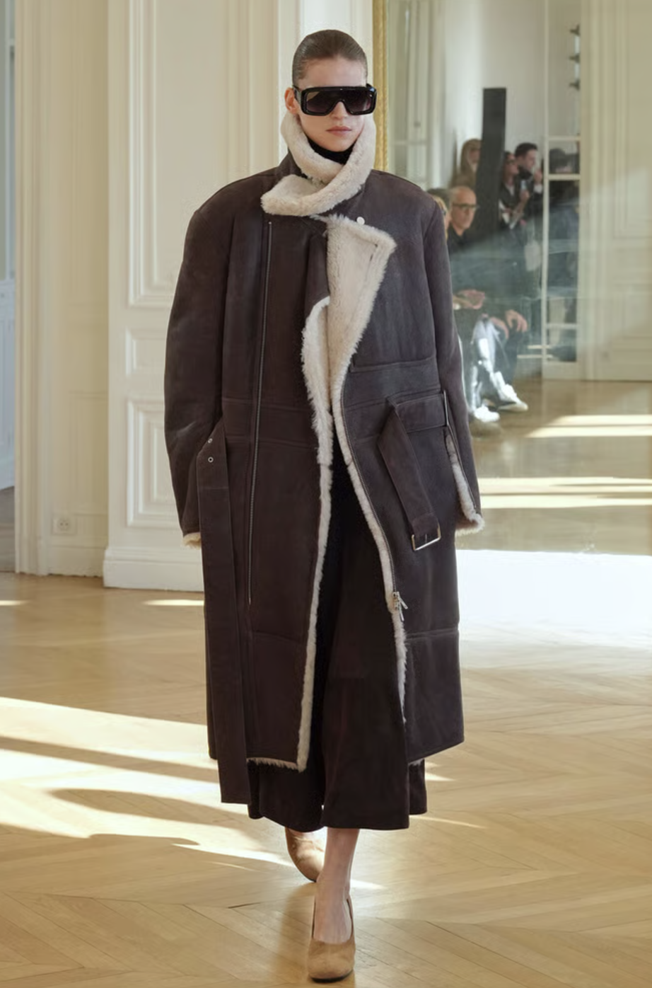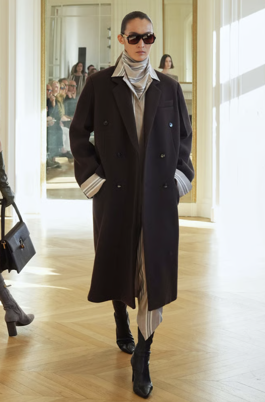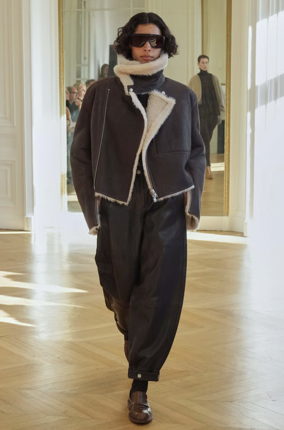 A medida que avanzaba la colección, las capas se convirtieron en el eje central. Abrigos de corte amplio, confeccionados en lanas suntuosas, se combinaban con piezas inferiores más ajustadas para jugar con las proporciones. La maestría de la marca reside en su capacidad para superponer texturas sin añadir peso visual, creando un efecto de profundidad que resulta fascinante. Es una oda al diseño funcional donde cada elemento tiene una razón de ser.