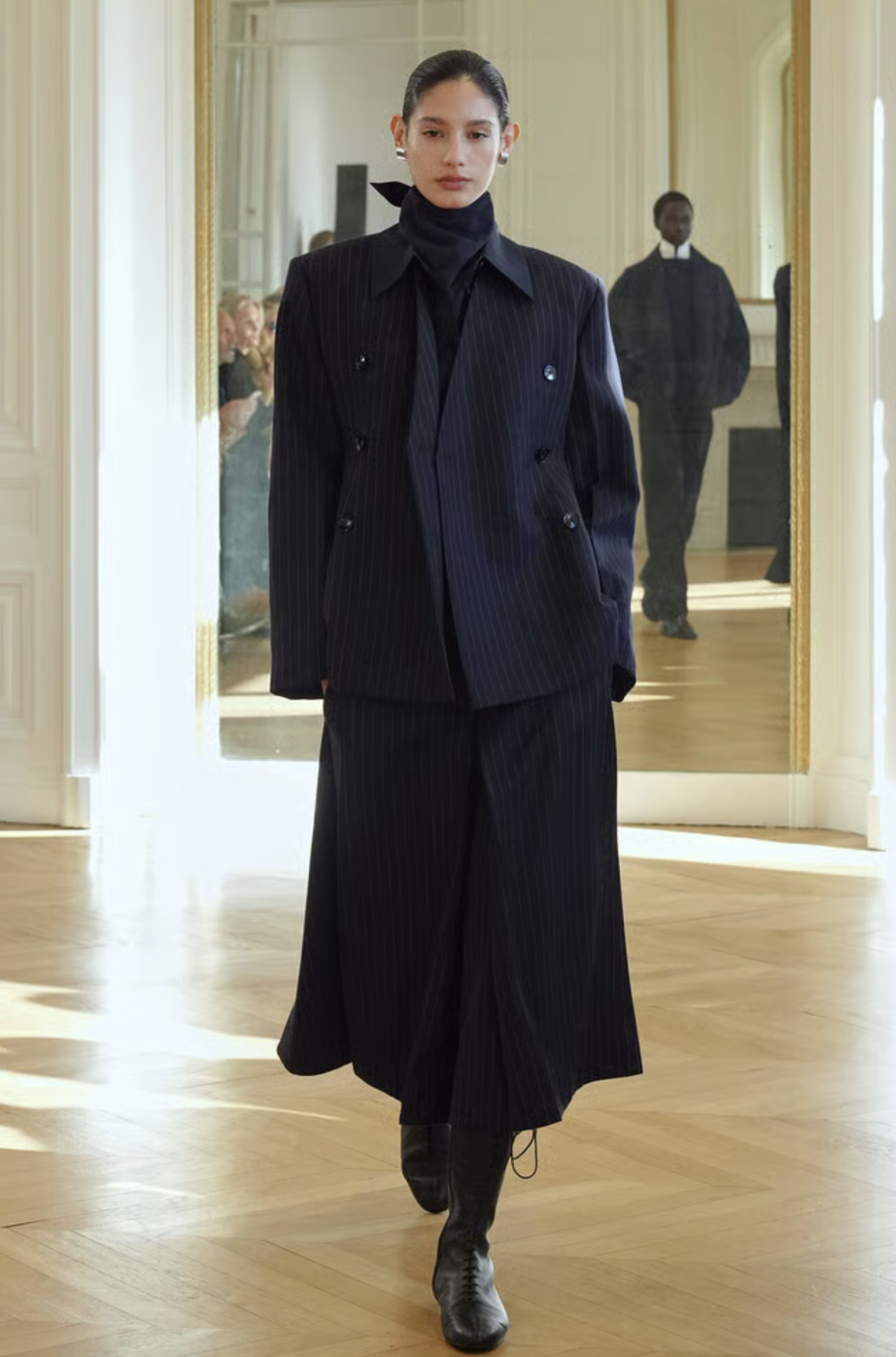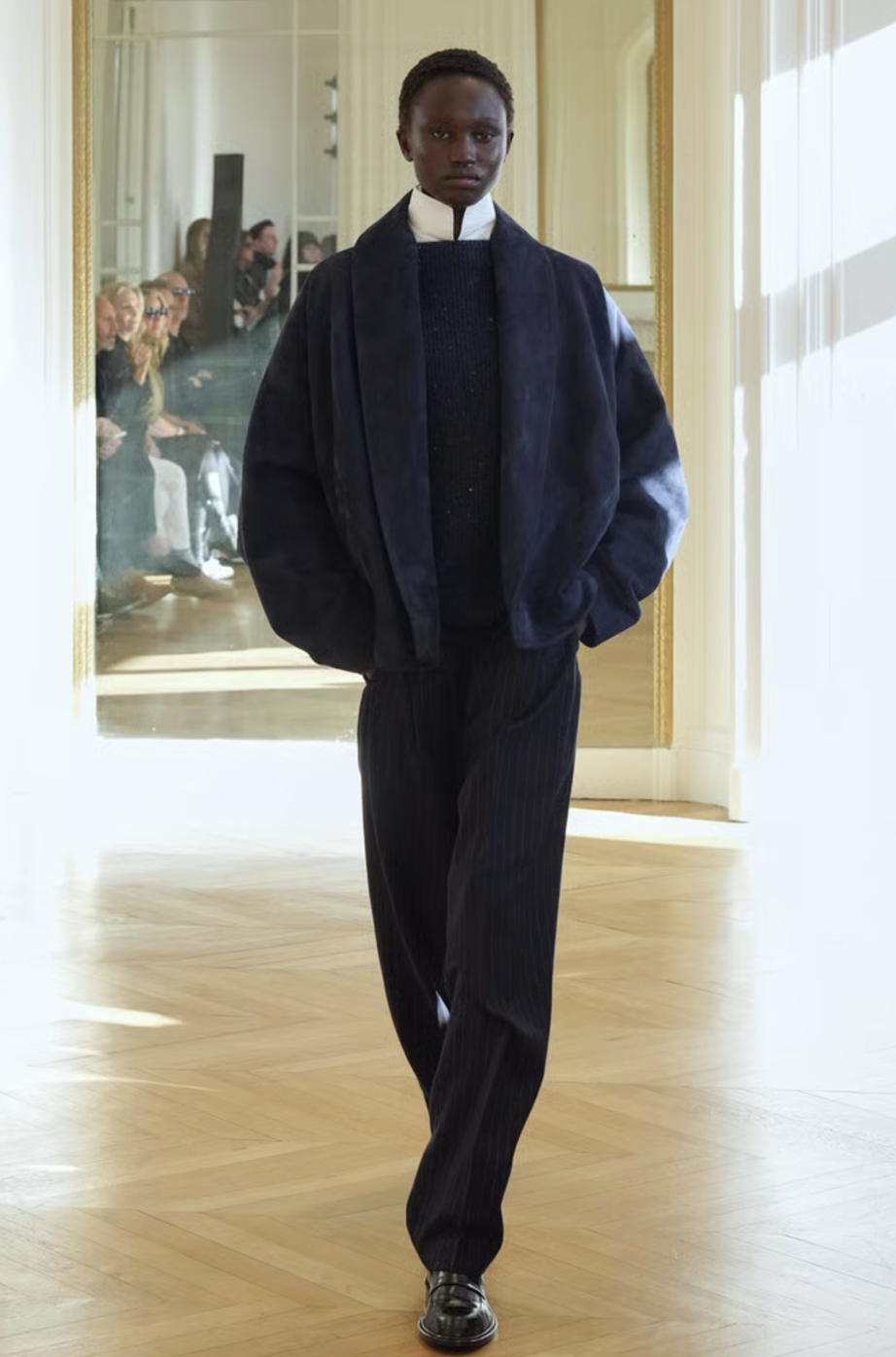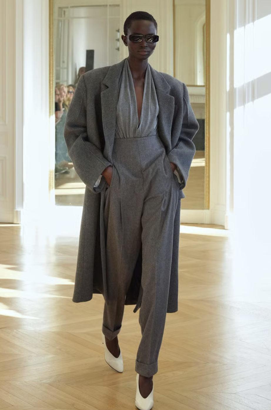 El desfile comenzó con una serie de conjuntos que rinden homenaje al poder de la sastrería. Vimos blazers de hombros estructurados, cortados con una precisión milimétrica que evoca la tradición de la alta costura pero con una ligereza moderna. La paleta cromática en tonos grises cenizos y carbón permitió que el corte fuera el verdadero protagonista, logrando un equilibrio perfecto entre la formalidad de oficina y la versatilidad necesaria para el día a día.