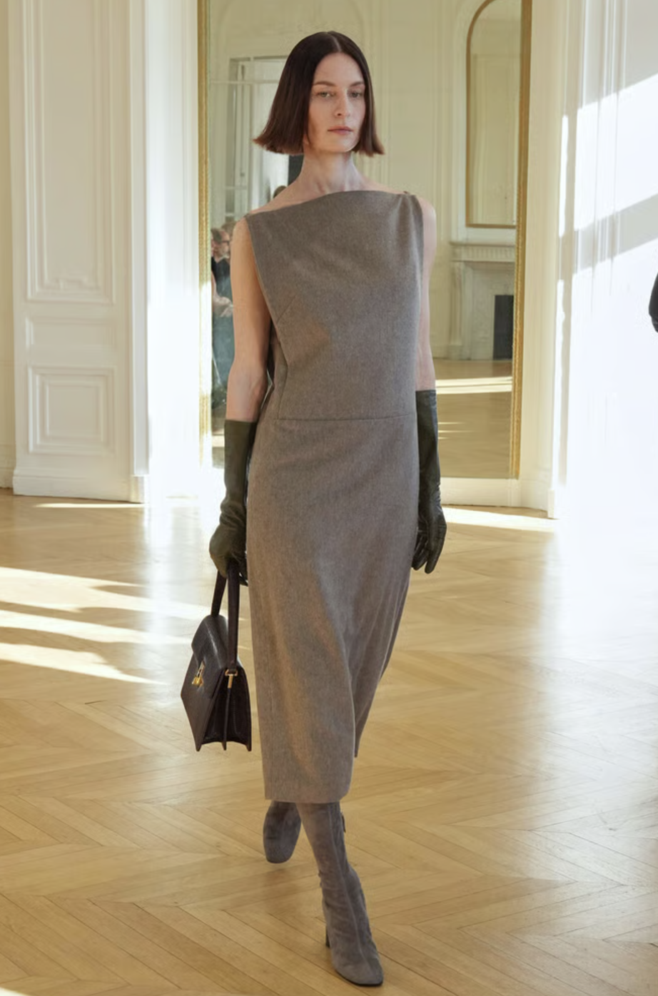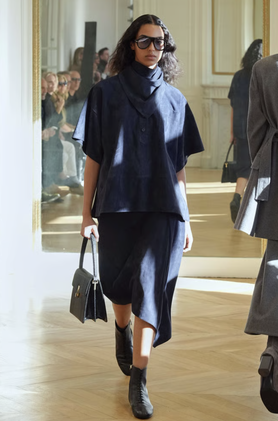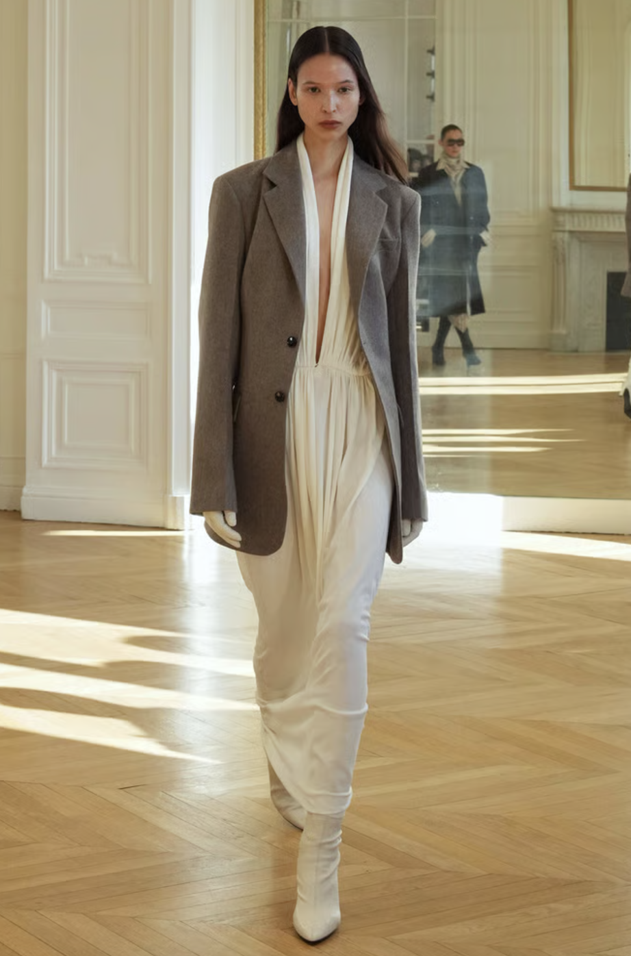 El desfile comenzó con una serie de conjuntos que rinden homenaje al poder de la sastrería. Vimos blazers de hombros estructurados, cortados con una precisión milimétrica que evoca la tradición de la alta costura pero con una ligereza moderna. La paleta cromática en tonos grises cenizos y carbón permitió que el corte fuera el verdadero protagonista, logrando un equilibrio perfecto entre la formalidad de oficina y la versatilidad necesaria para el día a día.