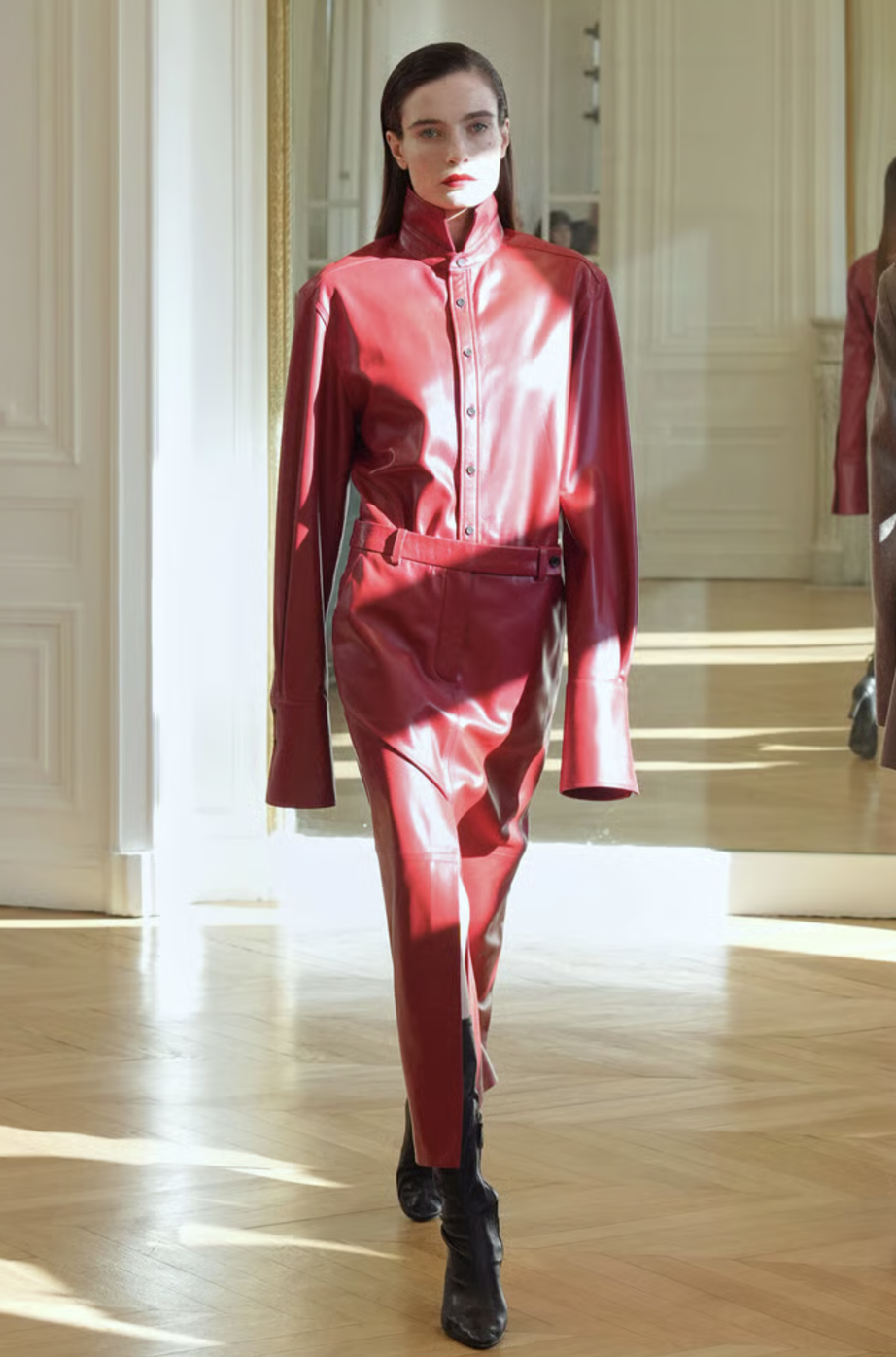 Hacia el final de la presentación, la paleta neutral se vio interrumpida por una pieza que capturó todas las miradas. Un diseño en cuero de un rojo vibrante rompió la hegemonía de los neutros, demostrando que CO también entiende el valor de la declaración de estilo cuando se ejecuta con la contención adecuada. Este look final no solo destacó por su tonalidad, sino por cómo el material se adaptaba al movimiento del cuerpo.