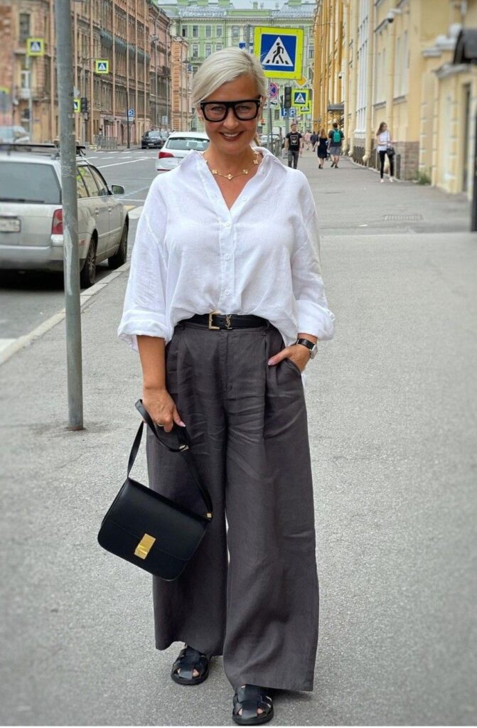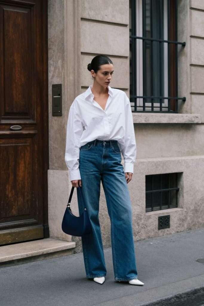 La combinación entre camisa blanca y jeans sigue siendo un referente atemporal. En su versión actual, se apuesta por una camisa de corte limpio combinada con denim de pierna ancha, logrando un balance entre lo casual y lo sofisticado. Este look es ideal para oficinas con códigos más relajados, donde la comodidad se integra con una imagen cuidada. Pequeños detalles como el calzado o los accesorios marcan la diferencia.