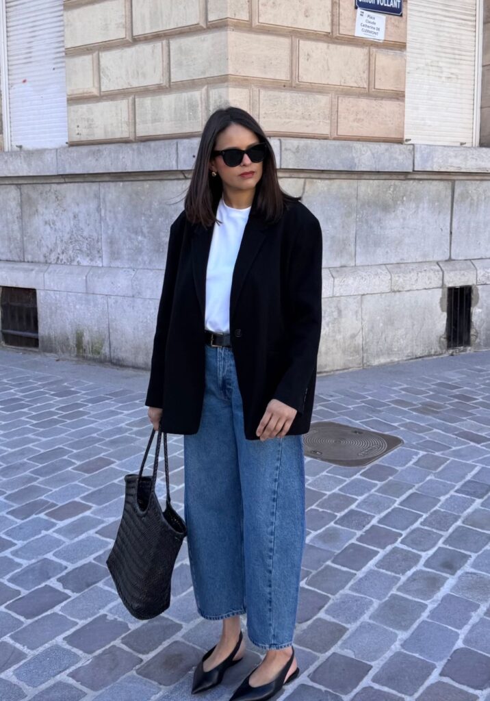 Esta combinación introduce una estética más accesible, alejando el blazer de su contexto tradicional y acercándolo al día a día. La clave está en equilibrar las capas sin perder la limpieza visual del conjunto.