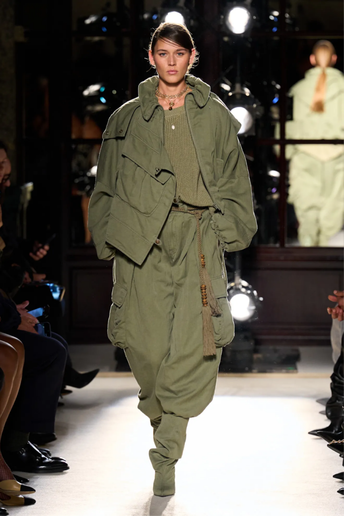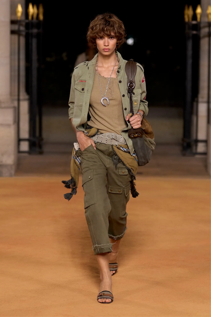 En las pasarelas de primavera verano 2026, esta tendencia ha sido reinterpretada con una sensibilidad moderna. Las siluetas se suavizan, los cortes se vuelven más fluidos y el resultado es una prenda que se aleja de lo estrictamente militar para abrazar una elegancia relajada. El pantalón verde militar deja de ser rígido para convertirse en una pieza dinámica que acompaña el movimiento.