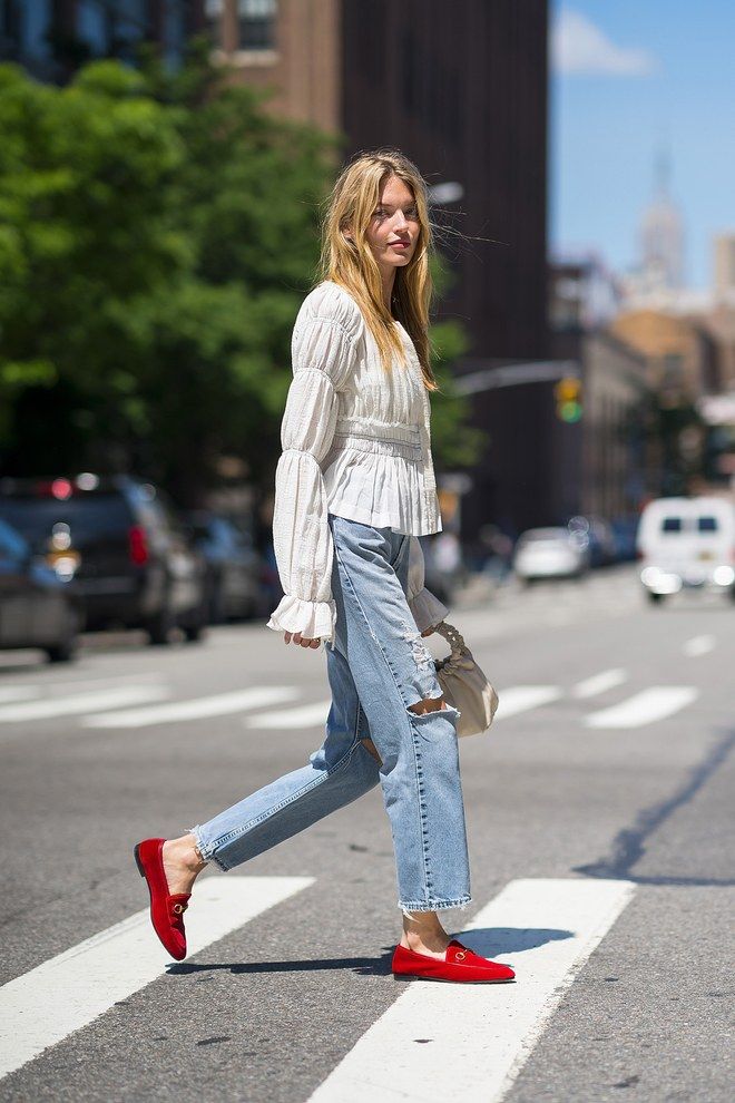 Los estilistas también recomiendan combinarlos con denim. Unos jeans rectos o ligeramente acampanados acompañados de zapatos rojos crean un look relajado que mantiene una fuerte identidad estética. Esta fórmula es especialmente popular en el street style de las semanas de la moda.