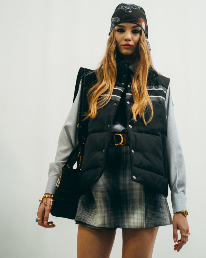 Si hay algo que caracteriza la era de Maria Grazia en Dior, son las statement T-shirts. Cuando debutó como creativa de la maison, la camiseta con la frase “We should all be feminist” se hizo viral. Siguiendo esa línea, la diseñadora imprimió otro par de T-shirts, complementándolas con chalecos andróginos. ¿El toque final? Las pañoletas con motivos de puntos en la cabeza.