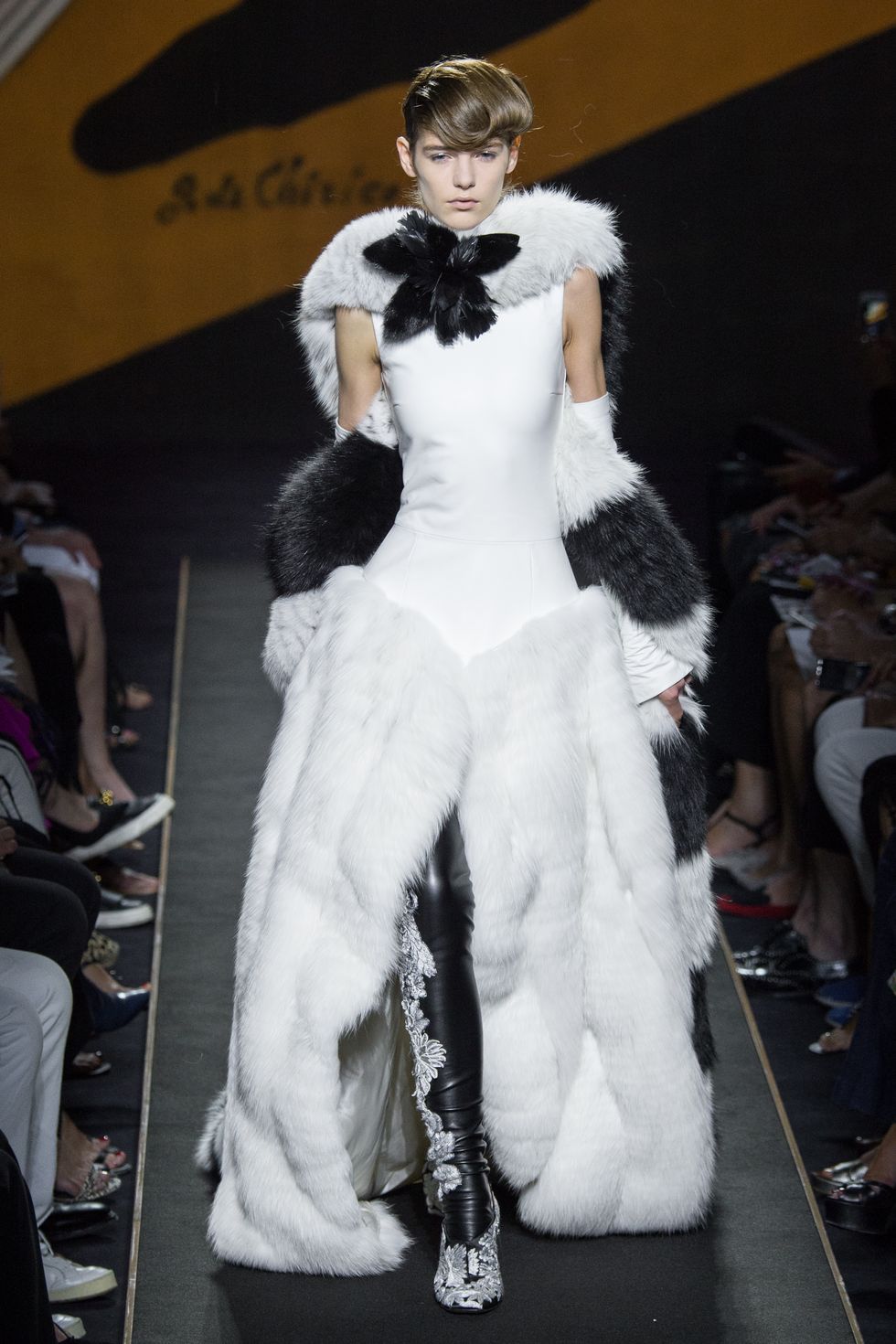En un look dónde predomina el negro, Fendi se atrevió a combinar el opuesto al blanco en un abrigo lleno de textura y orificios haciendo alusión a un espiral a lo largo de la prenda. Es una forma de ver en otros ojos la inspiración de este clima intenso y que se lleva el puesto número