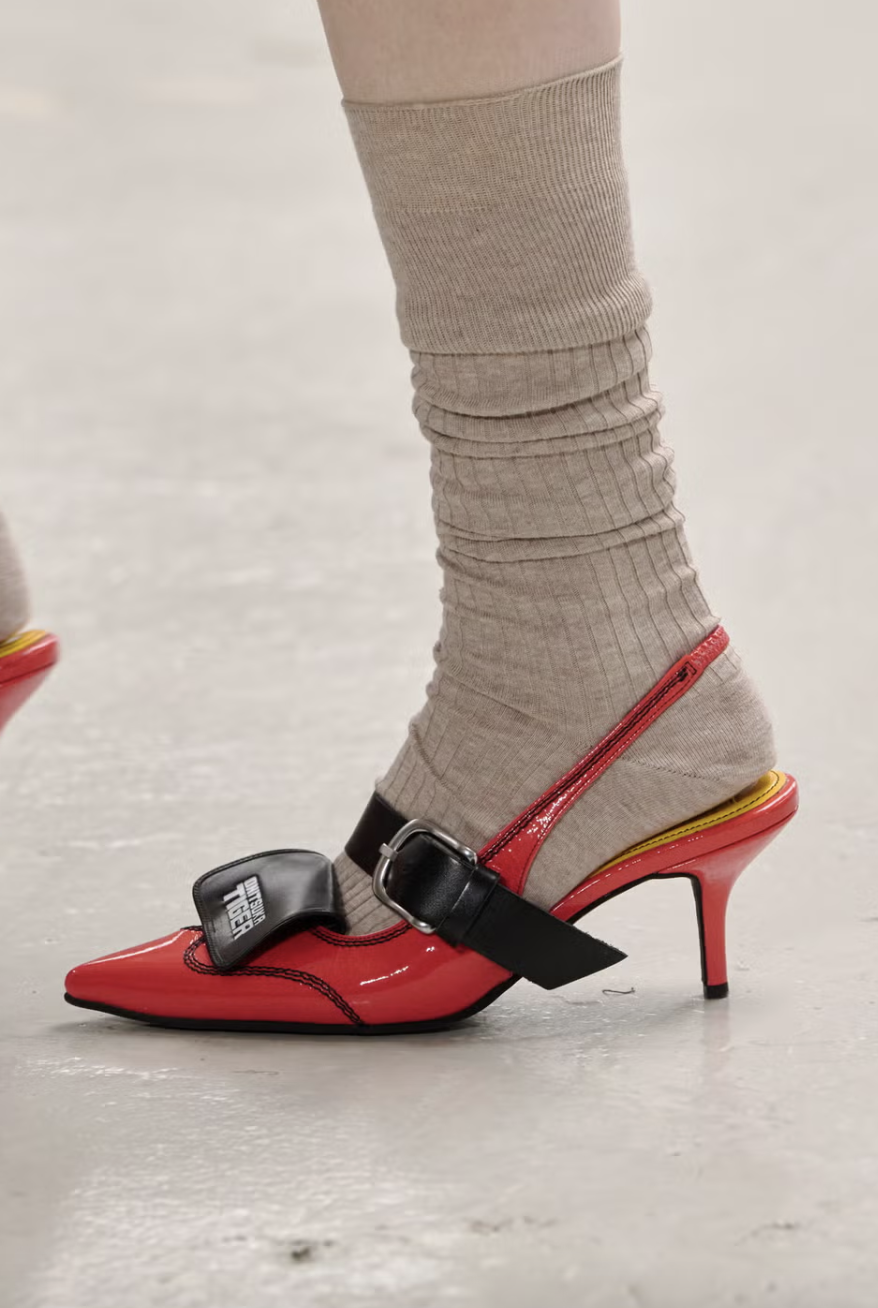 El primer diseño que capturó todas las miradas es un zapato de tipo slingback con una silueta extremadamente afilada. Este modelo incorpora una solapa de piel que evoca la lengüeta de las zapatillas clásicas, pero se ve intervenido por un cinturón decorativo que añade una capa de sofisticación urbana.