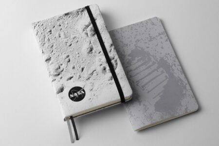 Diseñadas con cubiertas de cartón en tonos negro y gris, evocan el contraste entre la inmensidad del espacio y la luminosidad lunar. Cada libreta presenta detalles impresos y grabados que recuerdan huellas y texturas lunares. Incluyen stickers con temática espacial y bolsillo interior expandible.