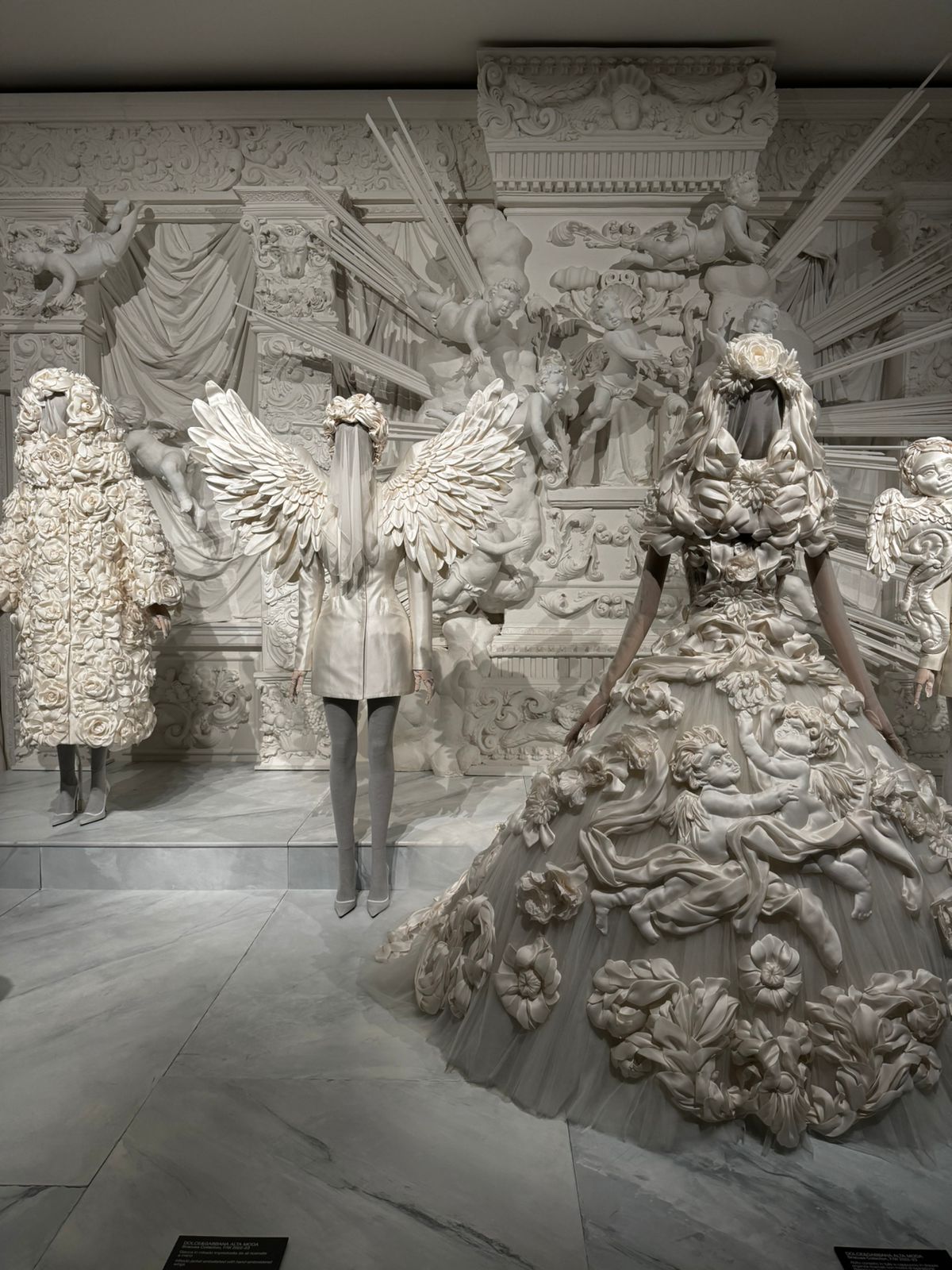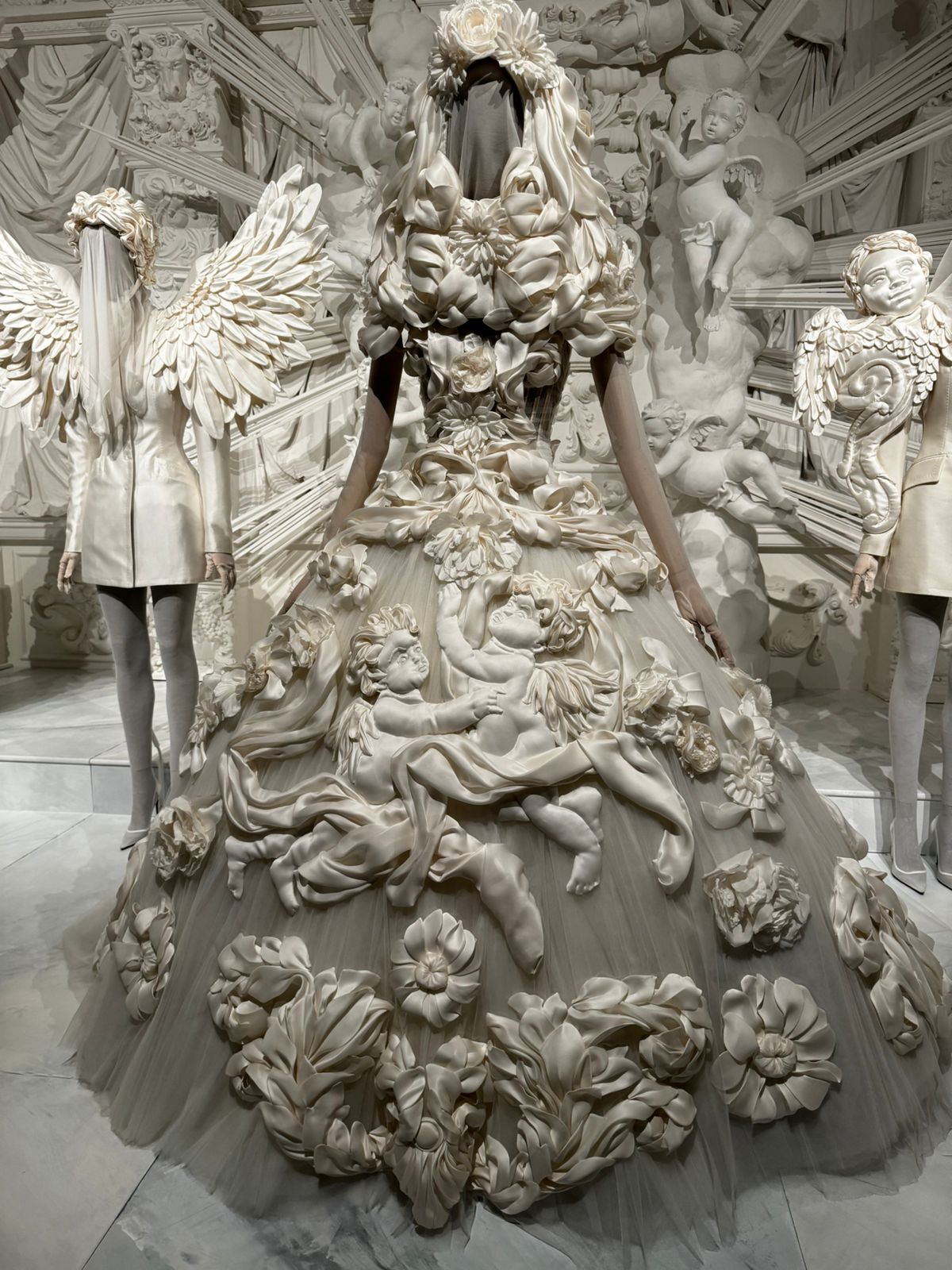 Blanco Barroco. Por si no lo sabías, el barroco puede ser blanco absoluto y es igual de impactante. Querubines, columnas, dan la tercera dimensión al escenario de esta habitación. Giacomo Serpotta, escultor siciliano, lleva el arte del stucco a otro nivel: el de una sofisticación que enmarca flores, patrones arabescos, todo en blanco. Una selección de la colección Stucchi de Alta Moda crea una sinfonía visual sin precedentes. El vestido central con querubines hechos de tela al igual que las flores fue uno de los que se presentó en Siracusa en 2022 cuando los diseñadores celebraron el décimo aniversario de su Alta Moda.
