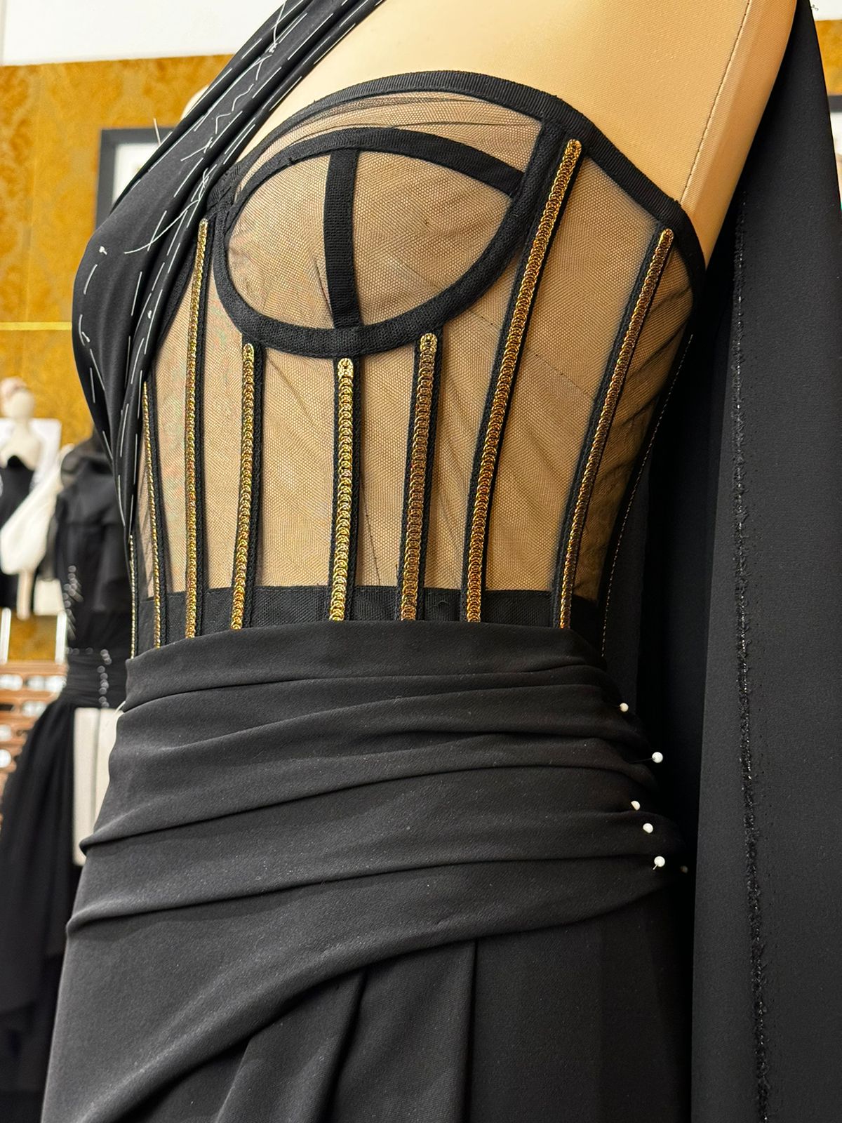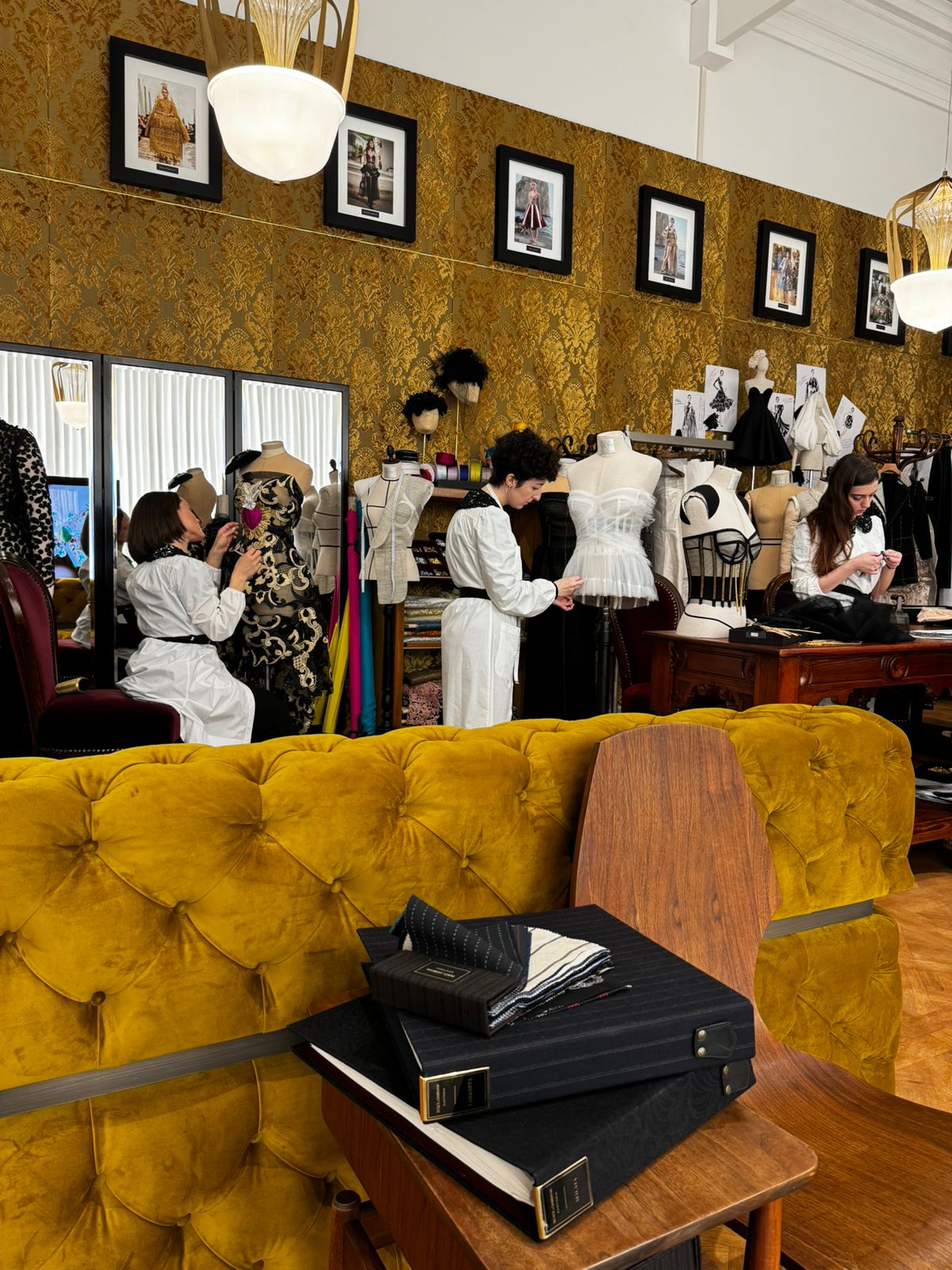 Sastrería, ornamentos y volumen. Emulando el espacio de trabajo del taller donde todas las ideas, sueños y locuras se cosen, arman, trazan y cortan para convertirse en realidades. Las gemas más espectaculares y los textiles más refinados fueron manipulados por expertos, y en esta sala tuvimos el privilegio de observar en vivo el proceso, el misterio, los secretos.