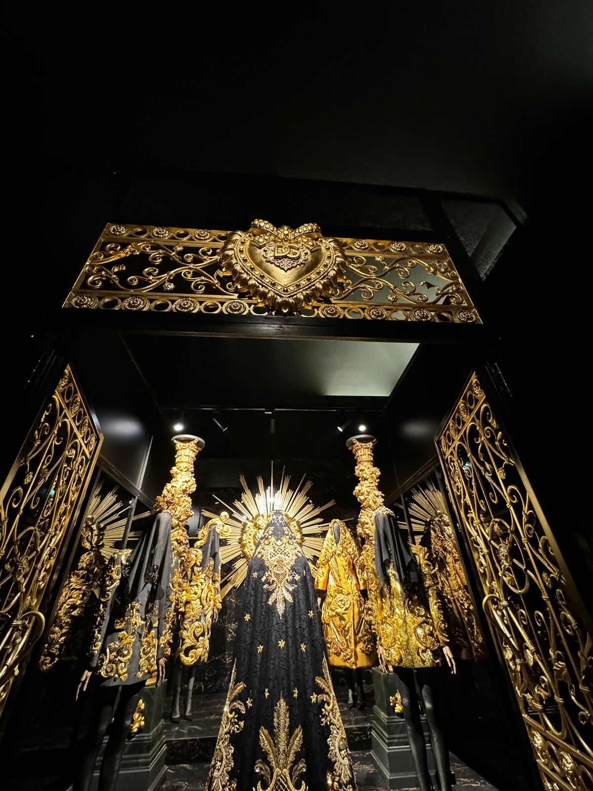 Devotion, un amor que rebasa cualquier límite en tiempo y espacio, eternidad pura. Lo bello y bien hecho lo rige el corazón sacro: Alta Moda y Alta Gioielleria se muestran en un espacio negro y dorado, opulencia absoluta, el barroco siciliano se dispone en el centro de la habitación sobre un taburete de terciopelo rojo, una Dolce Box Devotion también en rojo intenso, como su eterna devoción.