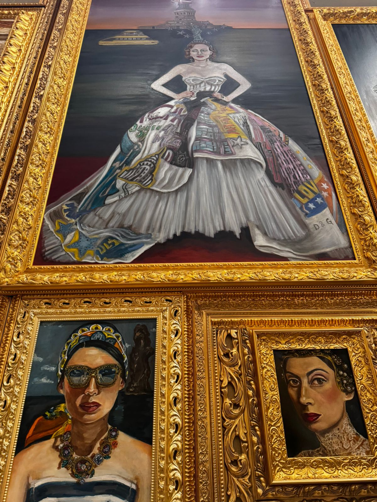 El primer salón fue Il Fatto a Mano, literalmente sentías que al verlo, se te salía el corazón. El impacto fue total e inesperado: óleos en marcos dorados, grandes y pequeños, con los diseñadores, con la artista, los objetos, retratos, todos pintados especialmente para la ocasión por la artista neoyorquina Anh Duong donde ella misma se retrata con algunas de las prendas únicas de la Alta Moda, pintando una obra para cada edición, para cada show. Las obras tapizaban las paredes que contenían las prendas seleccionadas por su riqueza artesanal o por la particularidad de sus materiales. Un diálogo entre ambas obras: las que se pueden vestir y las que se contemplan.