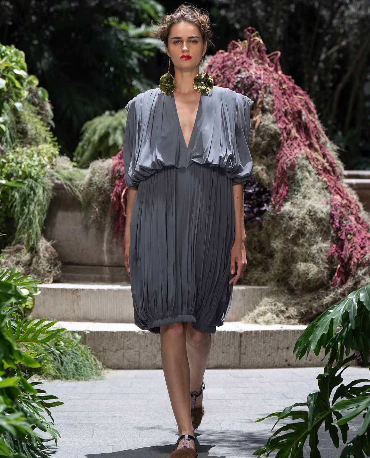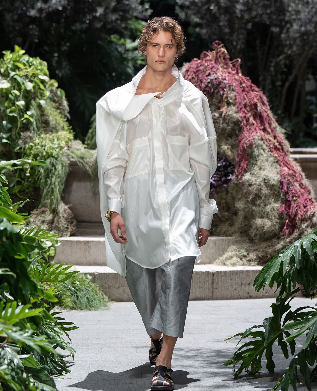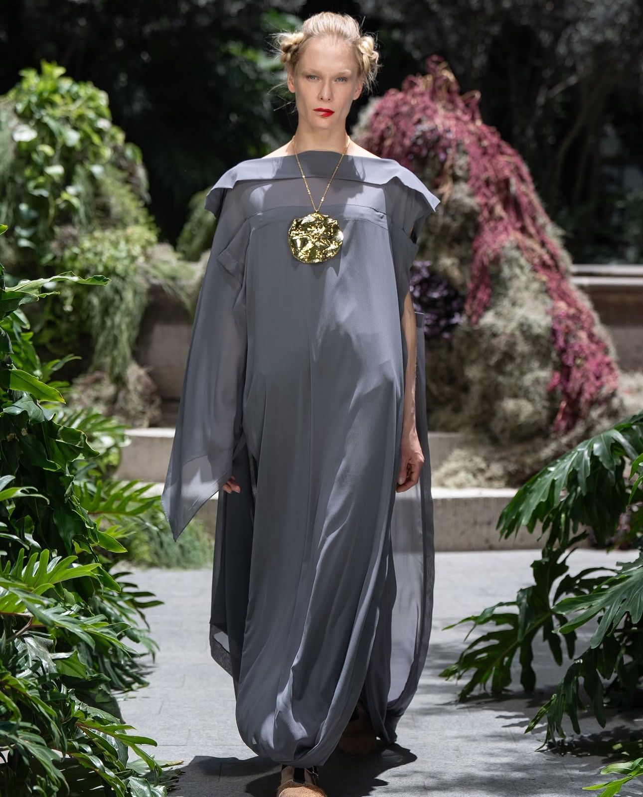 Algunas de las formas que más destacaron en el desfile fueron las superposiciones y las transparencias, así como los plisados ilimitados hechos en gasa y crepé de seda, seda metálica, así como varios tipos de lino.