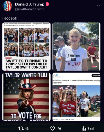 Además, puso una fotografía donde Taylor Swift, generada por IA, aparece vestida con un sombrero estampado con la bandera estadounidense y la leyenda “Taylor quiere que votes a Donald Trump”.