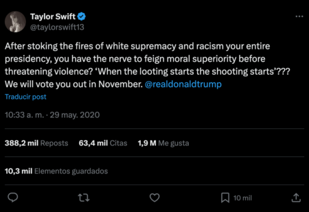 “Después de avivar el fuego de la supremacía blanca y el racismo durante toda su presidencia, ¿tienes el descaro de fingir superioridad moral antes de amenazar con violencia? Te echaremos en noviembre”, aseguró la cantante.