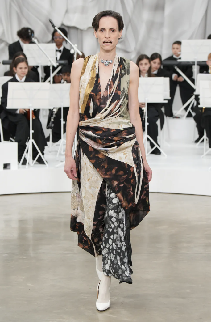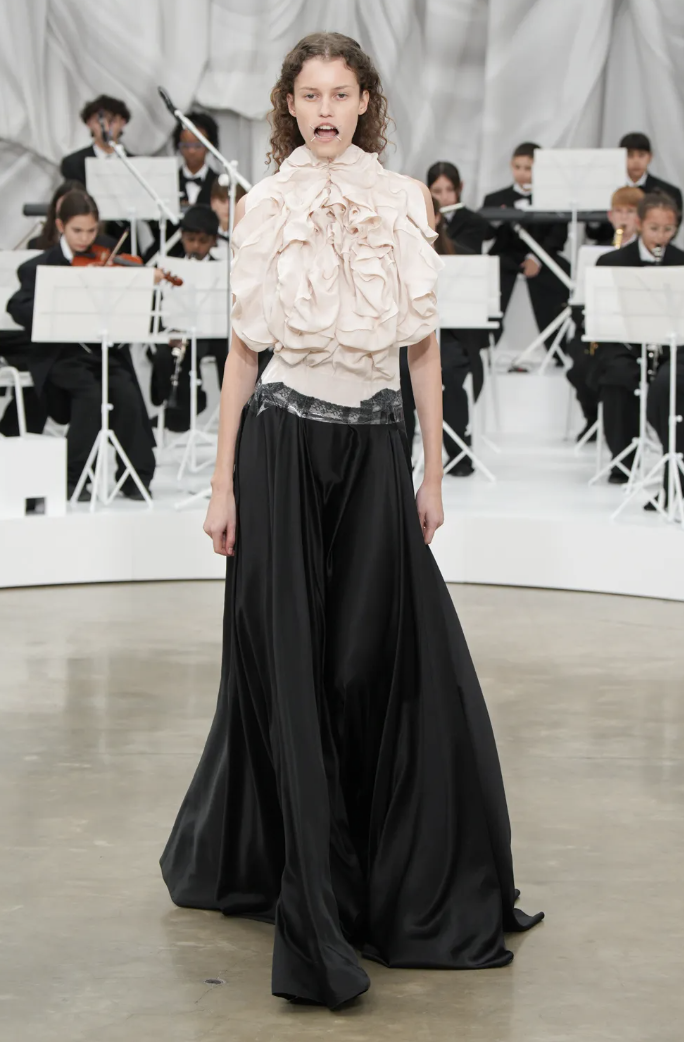 El espacio se llenó de sonidos de una orquesta juvenil, mientras las modelos avanzaban con paso etéreo, envueltas en prendas que parecían fragmentos de historia reconstruida.
