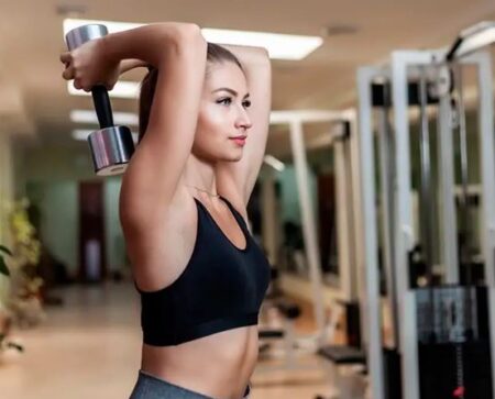 La extensión de tríceps es un ejercicio que permite aislar este músculo con mayor precisión. Puede realizarse con una mancuerna sostenida con ambas manos o con una sola.