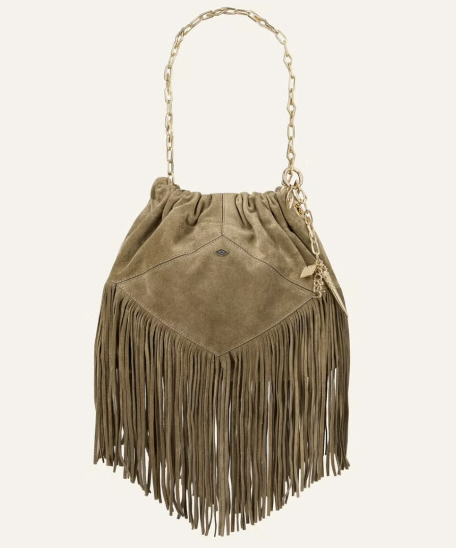 Para estilismos más románticos, el bolso pouch mini en ante, como el de Ba and sh, introduce una dimensión táctil irresistible. Combinado con faldas largas, blusas vaporosas o sandalias de tiras, construye una narrativa bohemia sofisticada.