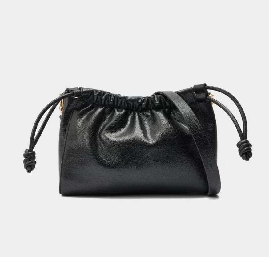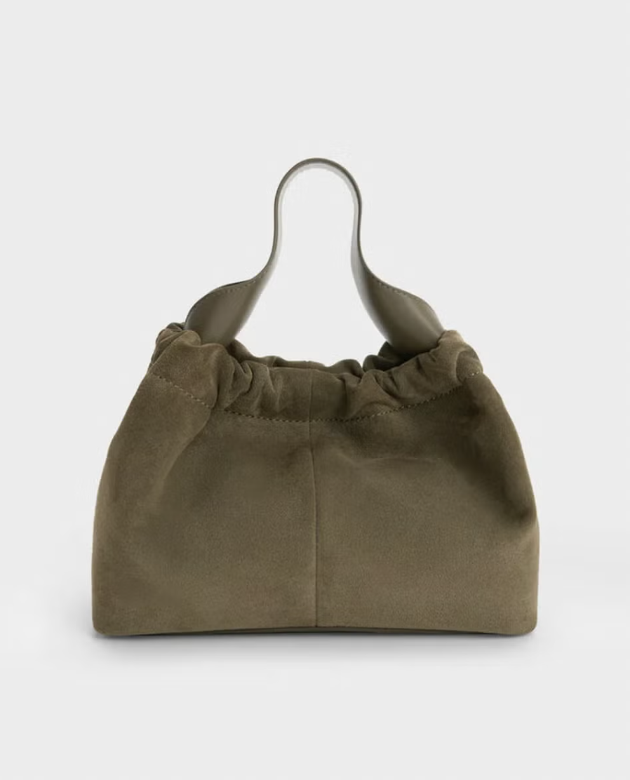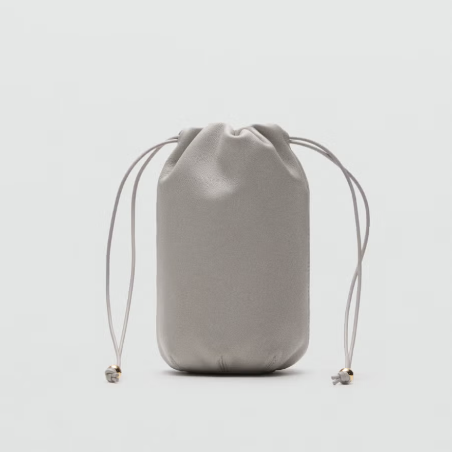 El volumen suave del bolso pouch aporta textura al conjunto, mientras el cierre fruncido añade un detalle distintivo que rompe con la rigidez estructural de otros bolsos clásicos.
