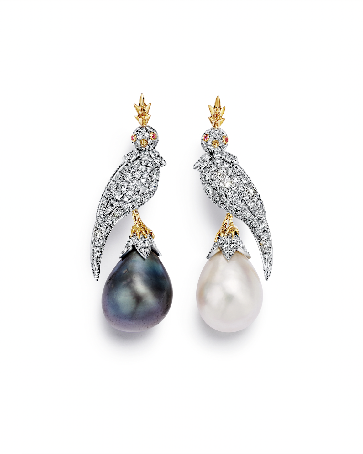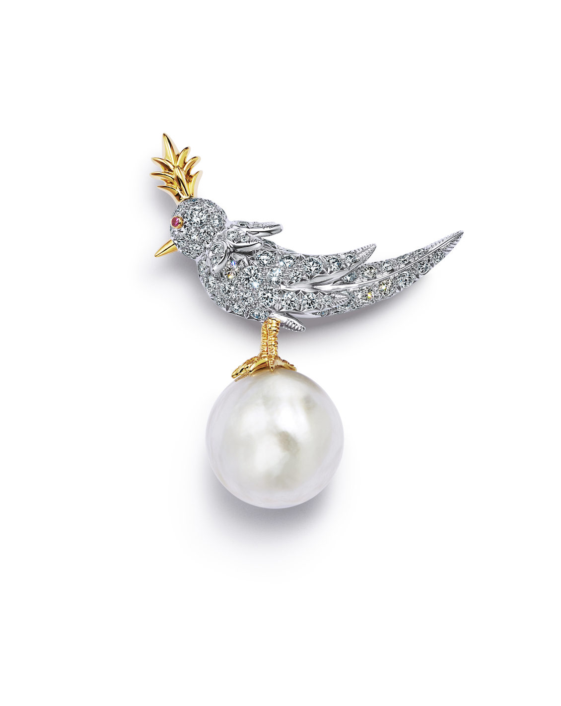 Creado por primera vez por Jean Schlumberger en 1965, el pájaro característico del diseñador, montado sobre una roca preciosa, evoluciona este 2023 en un conjunto de creaciones engastadas con perlas naturales de agua salada procedentes de la región del Golfo y adquiridas de la colección privada del empresario Hussain Al Fardan.
