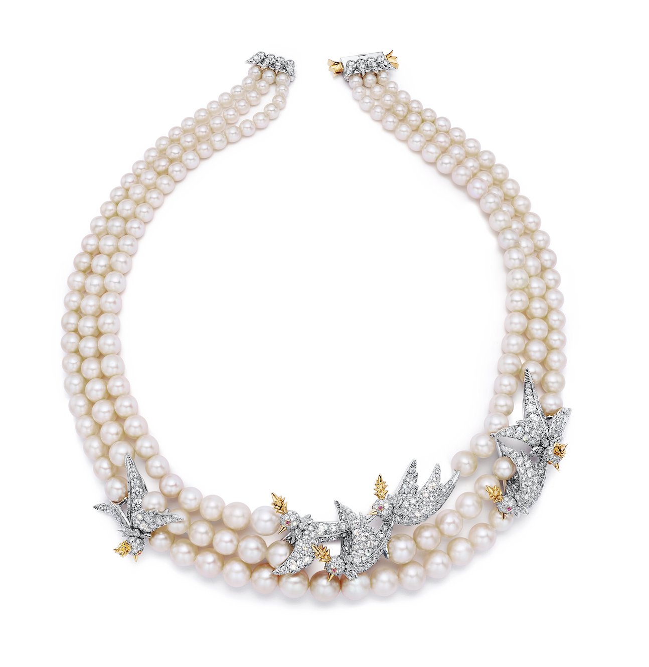 Las perlas son apreciadas por su tamaño, forma y brillo incomparable para dar vida a un collar de tres hilos con perlas naturales de agua salada en color blanco, de más de 316 quilates en total. Perlas barrocas de botón y casi redondas, reinventan al icónico broche. El collar, los pendientes y los anillos – engastados con perlas naturales de agua salada en color gris, gris oscuro, crema claro, marrón rosado claro y blanco – se definen por guiños característicos de la estética de Jean Schlumberger.
