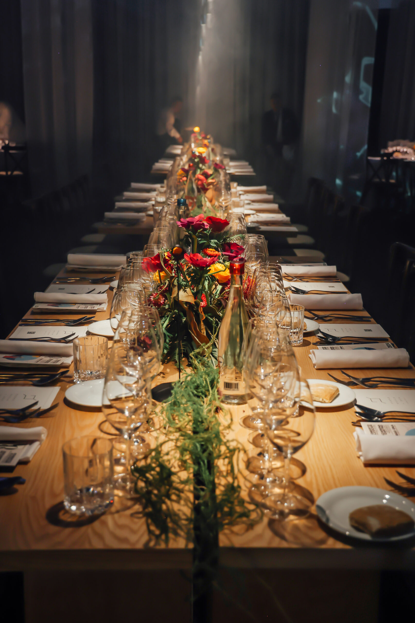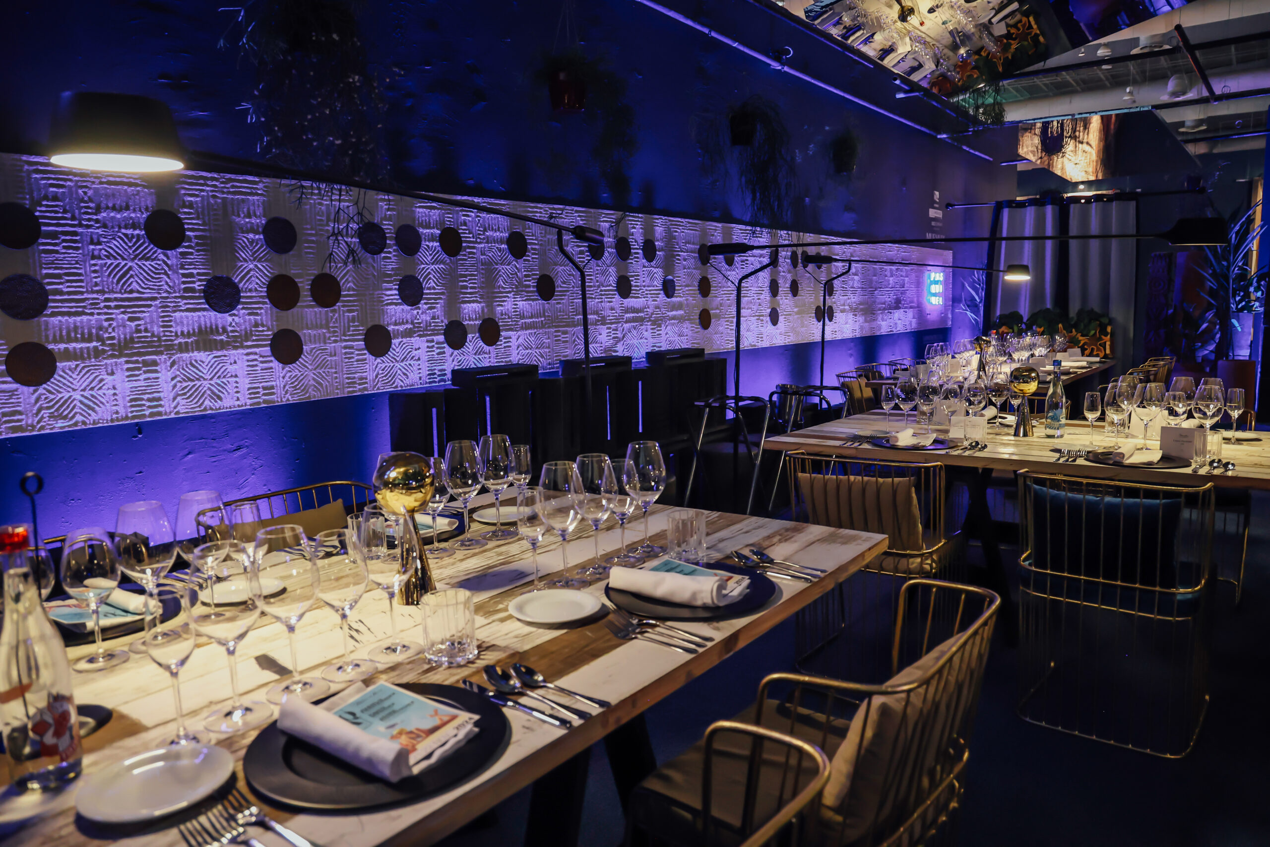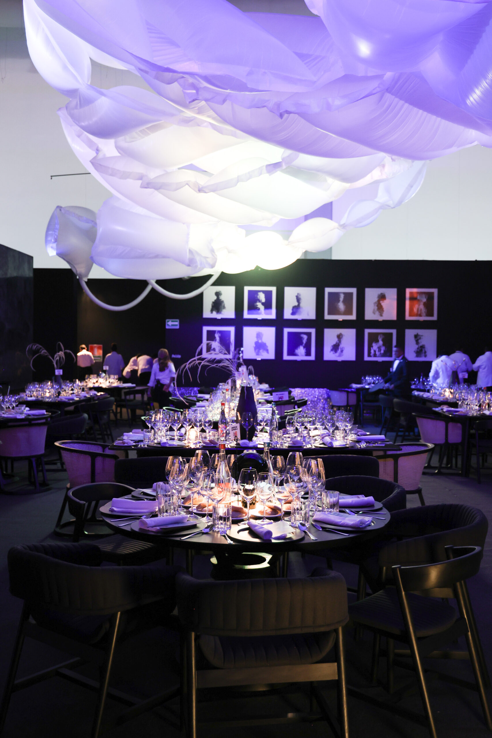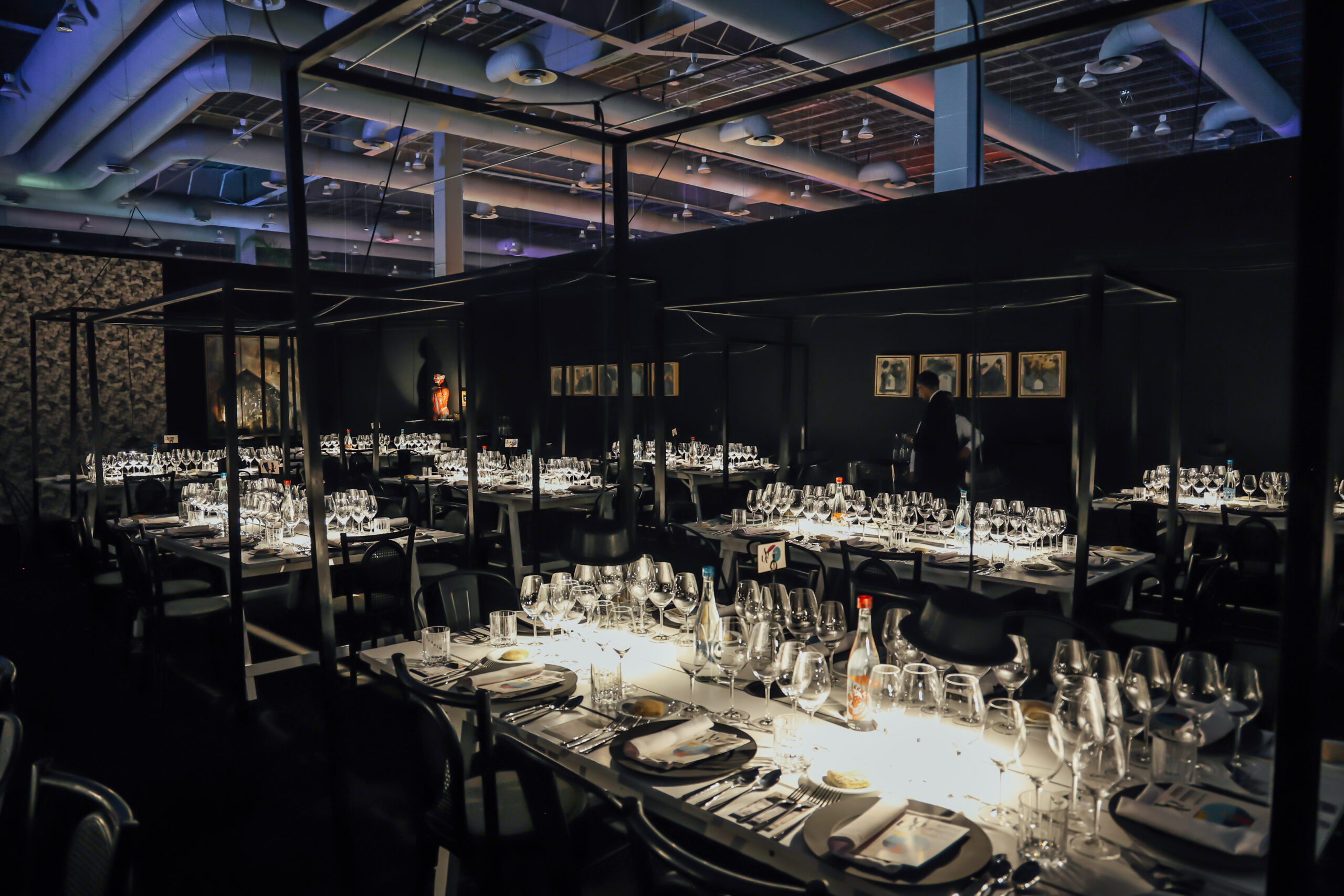 “Murmuri” es la creación de Pasquinel Studio. Este espacio fue inspirado en la sinergia de la oscuridad con el reflejo de la Luna, donde la carencia de luz exalta los otros sentidos. También se hacen alusiones al sistema Braille, volviéndola una experiencia multisensorial donde el sentido del gusto y del tacto se unen para generar una conexión con el comensal.