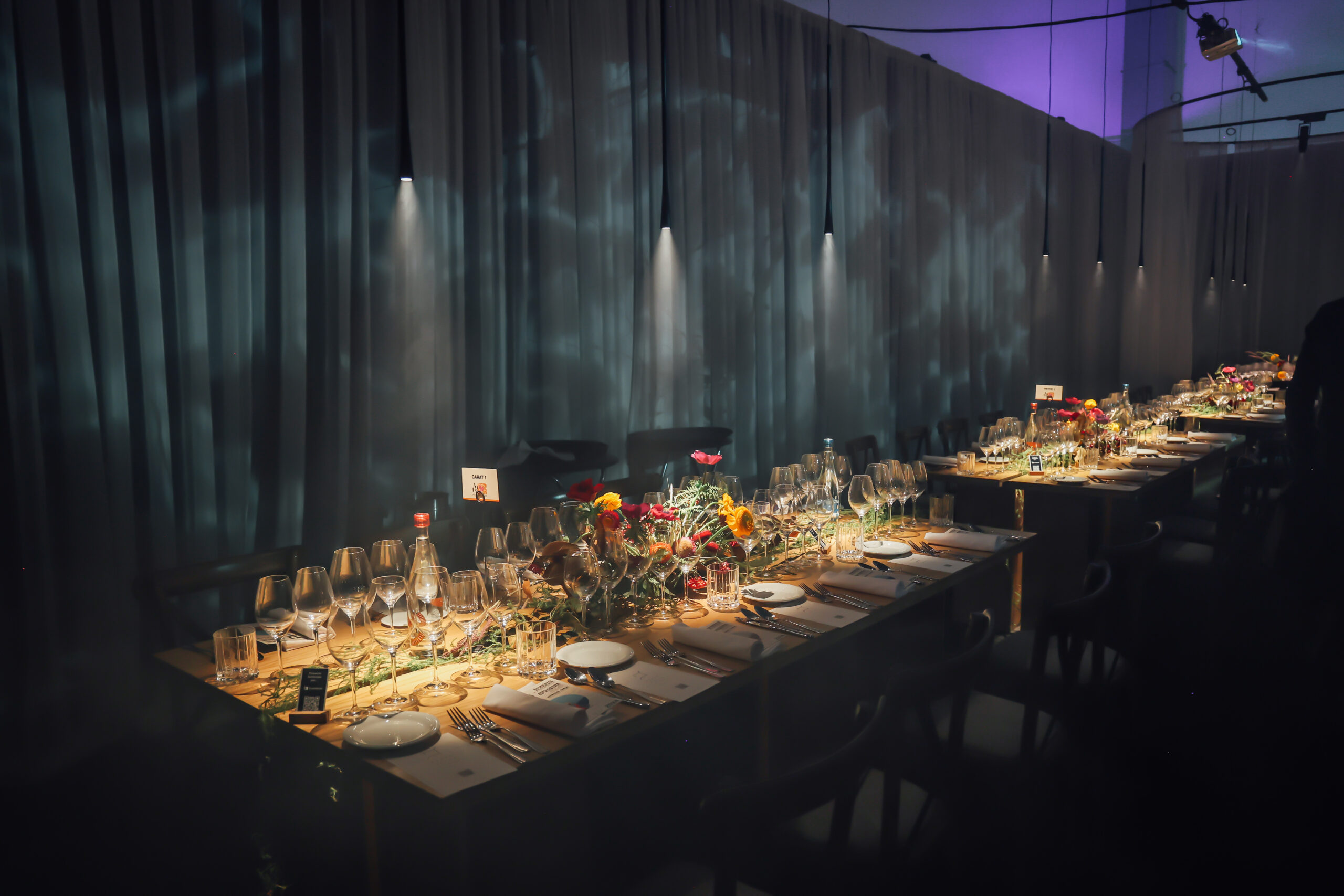 “Murmuri” es la creación de Pasquinel Studio. Este espacio fue inspirado en la sinergia de la oscuridad con el reflejo de la Luna, donde la carencia de luz exalta los otros sentidos. También se hacen alusiones al sistema Braille, volviéndola una experiencia multisensorial donde el sentido del gusto y del tacto se unen para generar una conexión con el comensal.