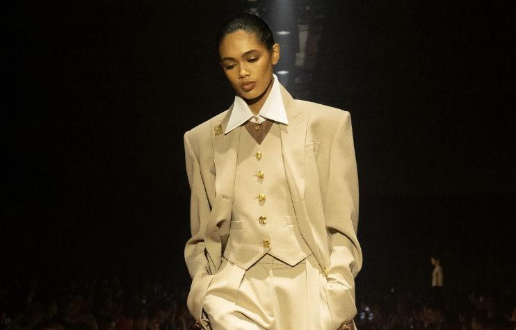 Roseberry abre el espectáculo con una declaración de autoridad técnica: un traje sastre de tres piezas que redefine la masculinidad en el cuerpo femenino. Con cuellos y solapas que se elevan con orgullo, el conjunto proyecta una seguridad inquebrantable.