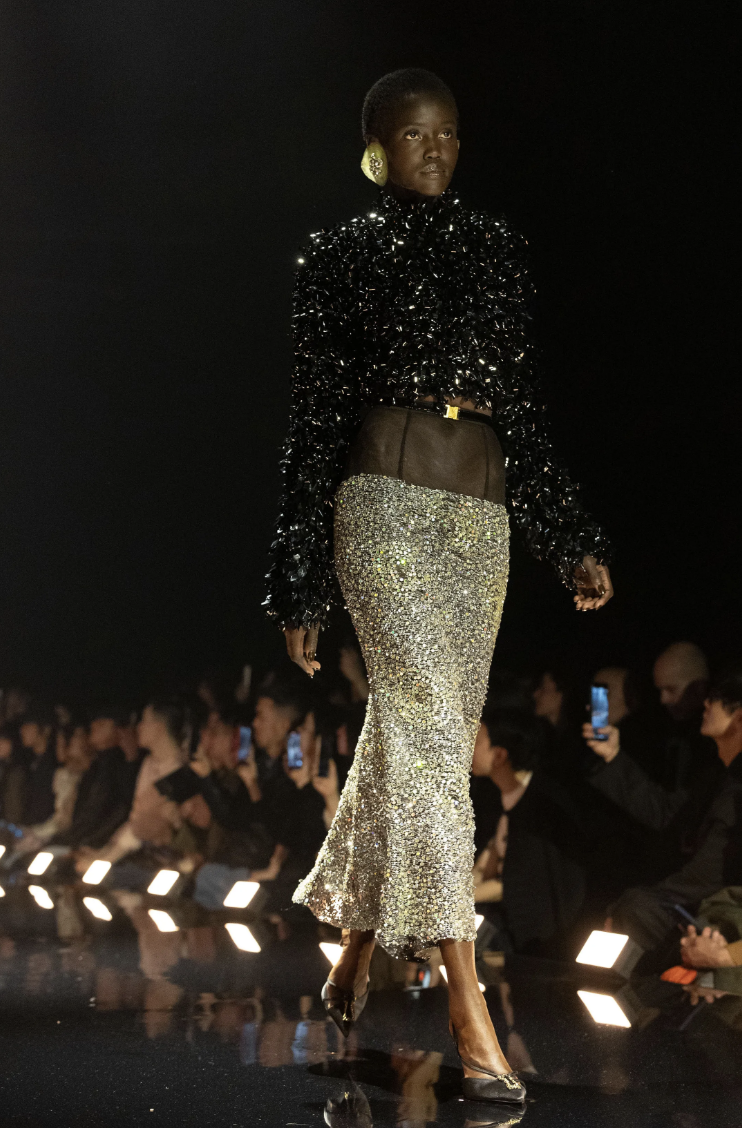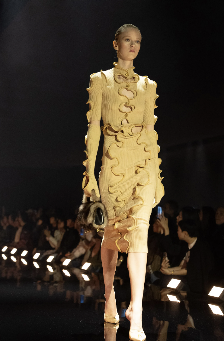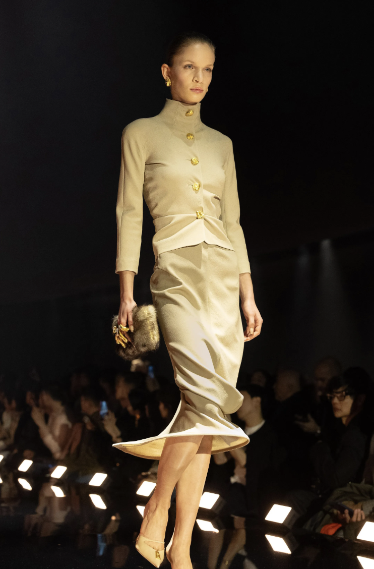 A medida que el desfile avanza, la colección revela una serie de faldas y chaquetas donde lo ordinario se ve interrumpido por lo fantástico. Roseberry utiliza su experiencia en el patronaje para crear cortes que parecen levitar, adornados con una botonadura que imita joyas anatómicas.