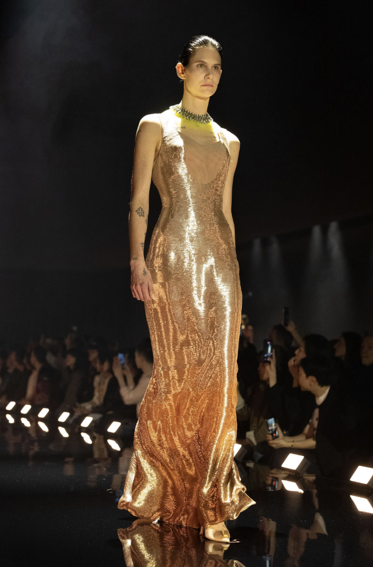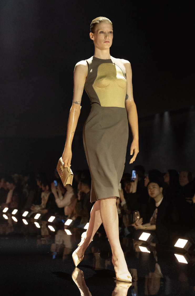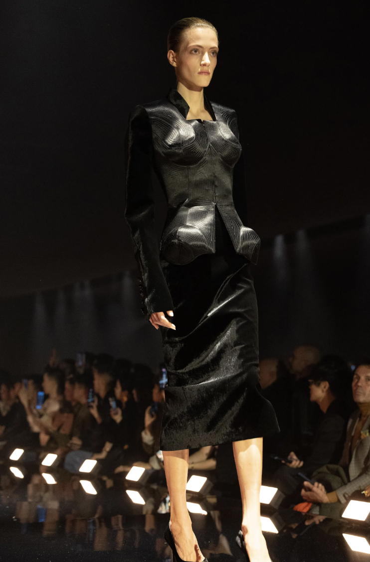 La propuesta alcanza un nivel de impacto editorial con el traje de falda que distorsiona las líneas corporales de manera poética. Utilizando rellenos estratégicos que evocan la obra de Sarah Lucas, el diseñador acentúa hombros, pechos y caderas para crear una silueta que es mitad humana y mitad escultura.