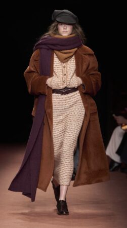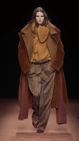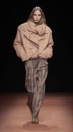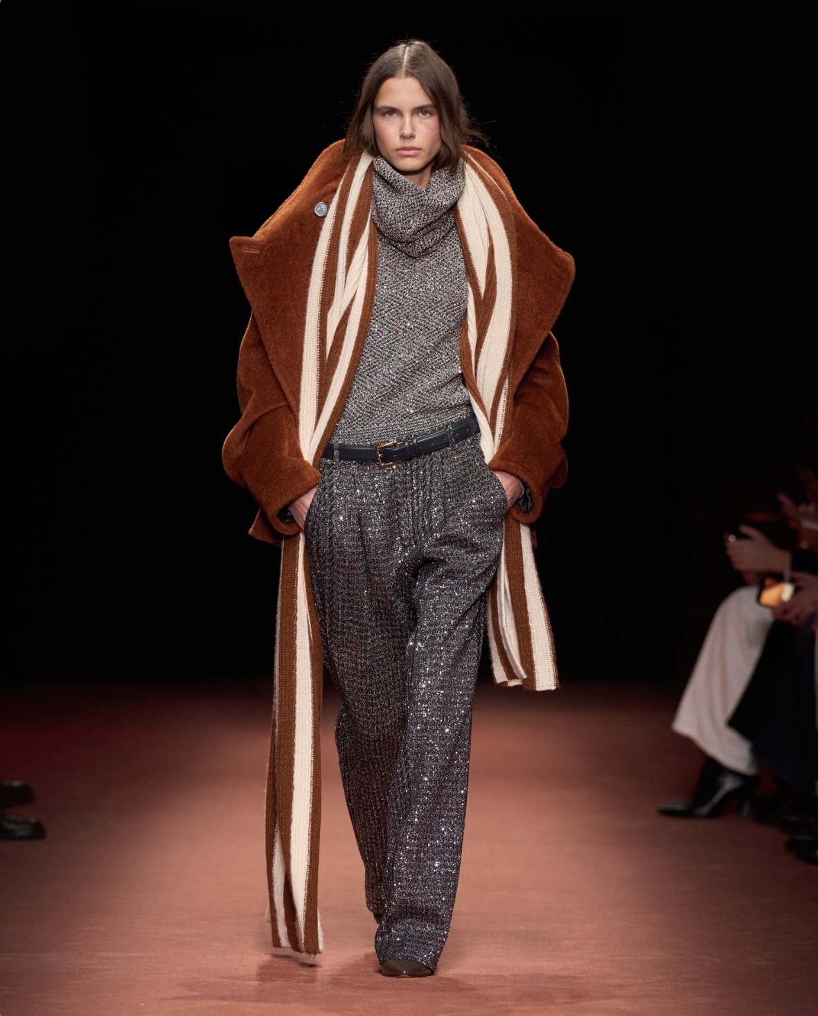 El tejido de punto es la estrella, bajo estas texturas, la colección para esta temporada, encuentra un sentido que ha distinguido a la casa durante años. Los brillos discretos, pero distribuidos en la mayoría de las prendas, aportan ese toque único que armoniza la temporada otoño/invierno.