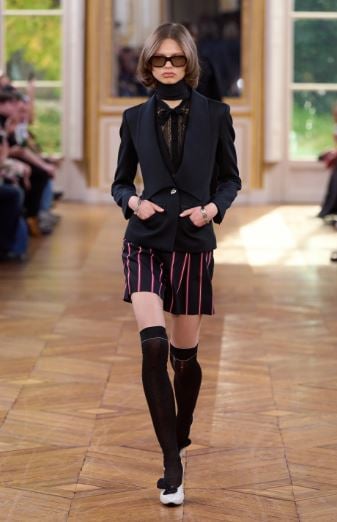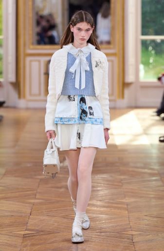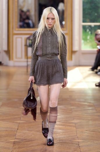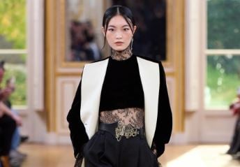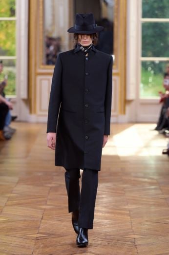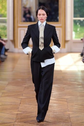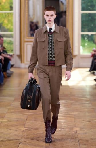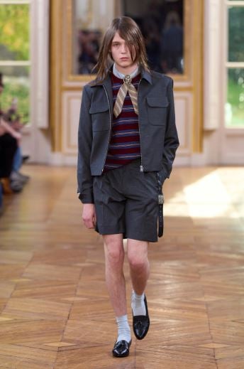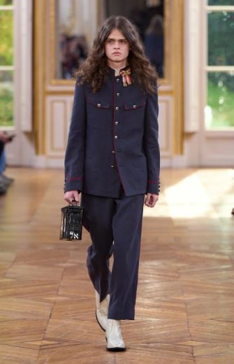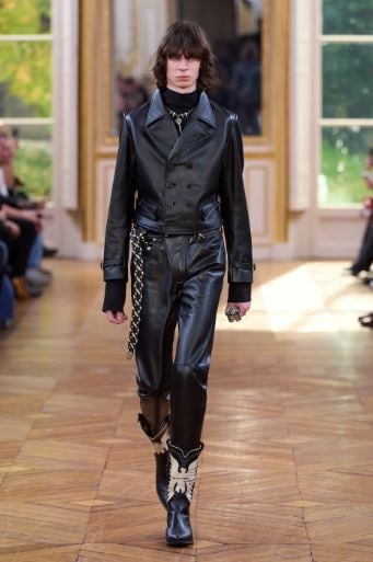 La reputación vanguardista de la casa – cuyo nombre se traduce como “Niños Ricos Deprimidos” – se mantuvo intacta. Levy le dio a las corbatas preppy un toque decadente con cierres de plata y cinturones con pedrería. Pantalones blancos de pinzas anchas, casi aristocráticos, se volvieron atrevidos al combinarlos con cuero negro y lentes de sol, como si fuera el niño rico regresando a un almuerzo familiar tras haber estado perdido todo un fin de semana.