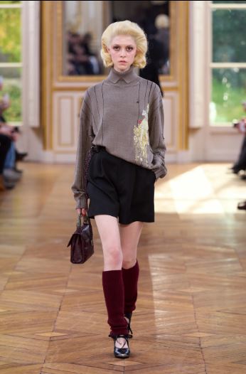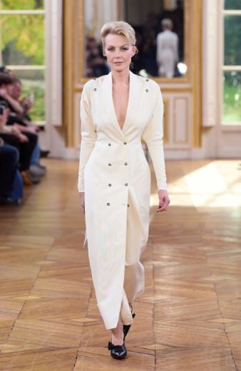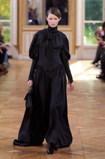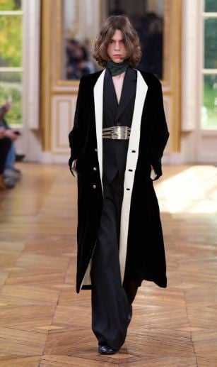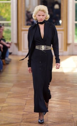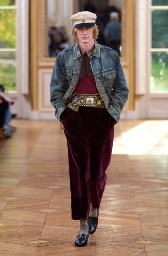 Un abrigo vaquero de aspecto militar, con botones brillantes y un corte impecable, se combinó con botas de tacón de los años 70 y el pelo despeinado al estilo Woodstock de una modelo. Era contracultura repleta de sastrería burguesa.