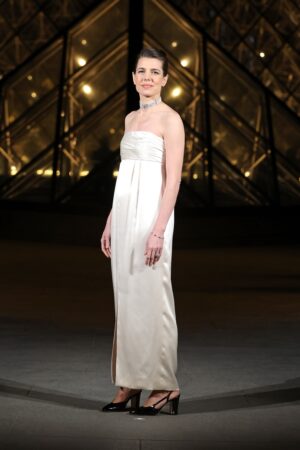 La nieta de Grace Kelly, Carlota Casiraghi, optó por un conjunto de CHANEL que combinaba un vestido blanco de inspiración nupcial, con falda recta con abertura central, acompañado de un maxiabrigo de tweed negro. Completó su look con un bolso Mini Square Classic Patent Single Flap y joyas de perlas y brillantes.