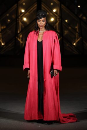 La supermodelo Naomi Campbell combinó su vestido negro con un abrigo rosa fucsia de CHANEL, que termina con una larga cola, aportando contraste a su conjunto.
