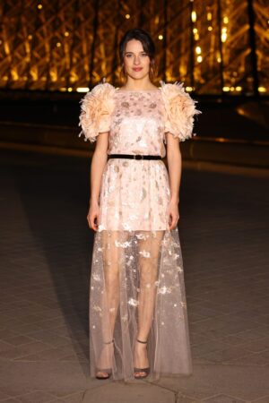 La actriz francesa usó un vestido de jacquard floral cubierto de tul rosa pálido, con detalles multicolores y dramáticas mangas de globo completamente bordadas con plumas de la colección de Alta Costura Primavera 2025.