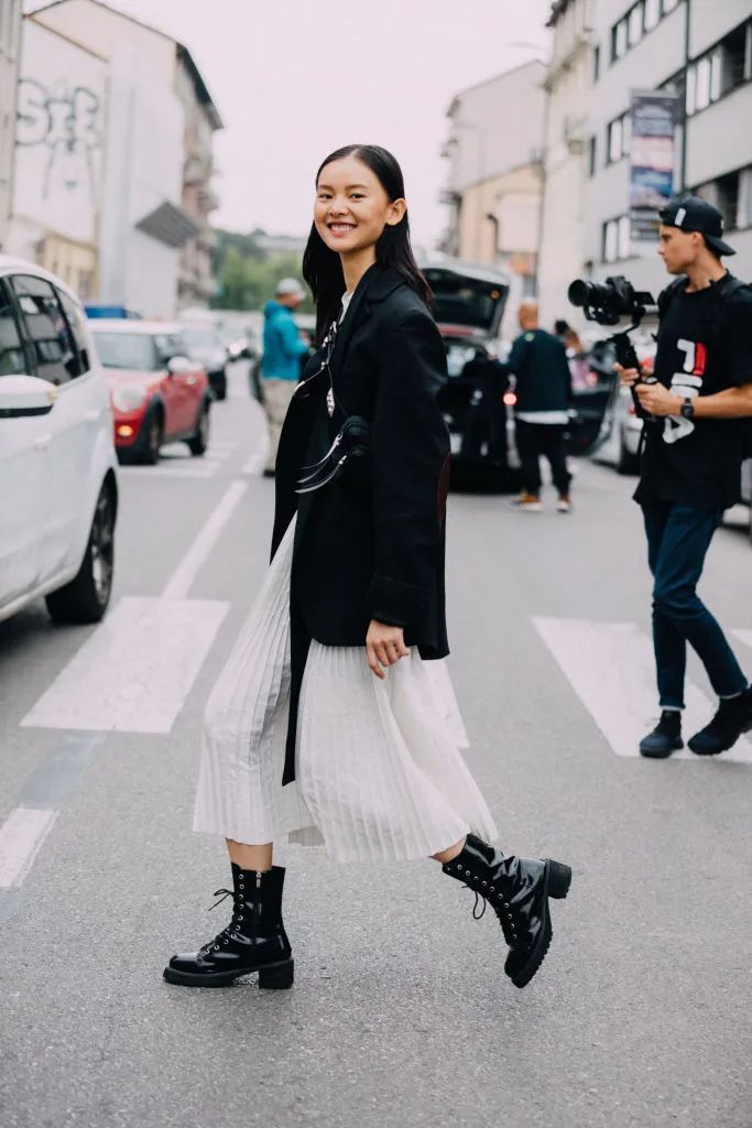 Falda plisada midi y botas biker