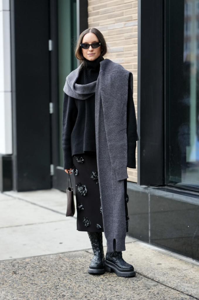 Los looks total black siguen siendo una apuesta segura. Sin embargo, el truco está en jugar con las texturas. Las faldas midi de lentejuelas en tonos oscuros, combinadas con botas negras de suela gruesa, añaden un toque brillante sin perder la sofisticación. Este look no solo es festivo, sino también sofisticado, perfecto para una salida nocturna o una cita especial.