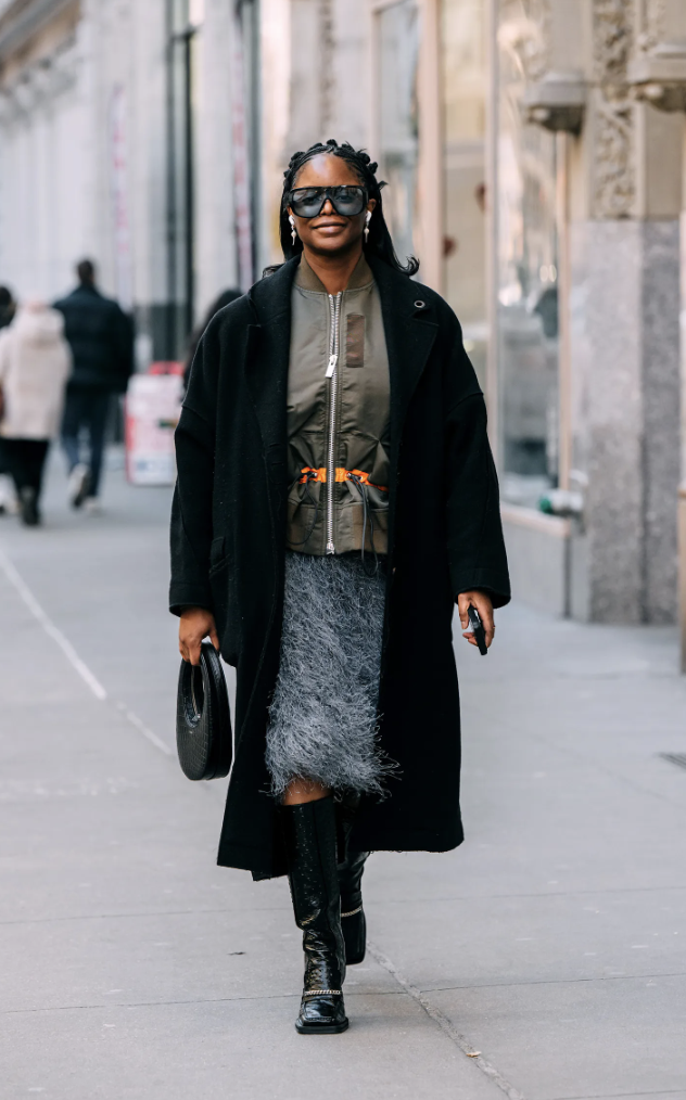 Las prendas con texturas peludas fueron una de las sensaciones del año pasado, y este 2026 siguen siendo esenciales. Una falda midi peluda, combinada con botas estilo mocasín, ofrece un look audaz y cálido para los días más frescos de primavera. Este estilo se mezcla con un toque de nostalgia, manteniendo una silueta moderna gracias a la elección de botas robustas que equilibran la suavidad de la falda.