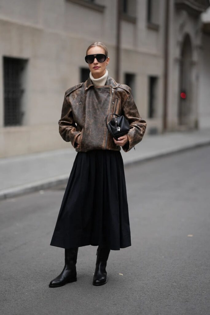 Siguiendo el regreso del estilo preppy, la falda plisada midi se reinventa con una longitud más favorecedora para esta temporada. Con un aire clásico y elegante, esta falda se combina con botas biker negras para dar un giro contemporáneo y audaz. La textura de la falda y la robustez de las botas crean una propuesta moderna y perfectamente equilibrada, ideal tanto para el trabajo como para eventos informales.
