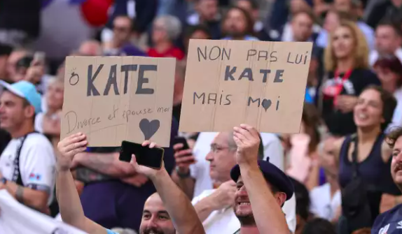 Fue durante el encuentro deportivo que Kate atrajo la atención de un par de asistentes, gracias a ese gran estilo y belleza que la caracteriza. Con un par de mensajes escritos en cartón, dos hombres pidieron matrimonio a la princesa.