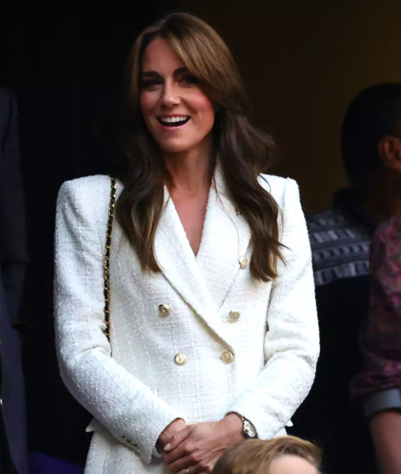 Kate vestía un saco blanco de tweed que la hacía lucir elegante y sencilla. Complementó el look con cabello suelto y joyas discretas.