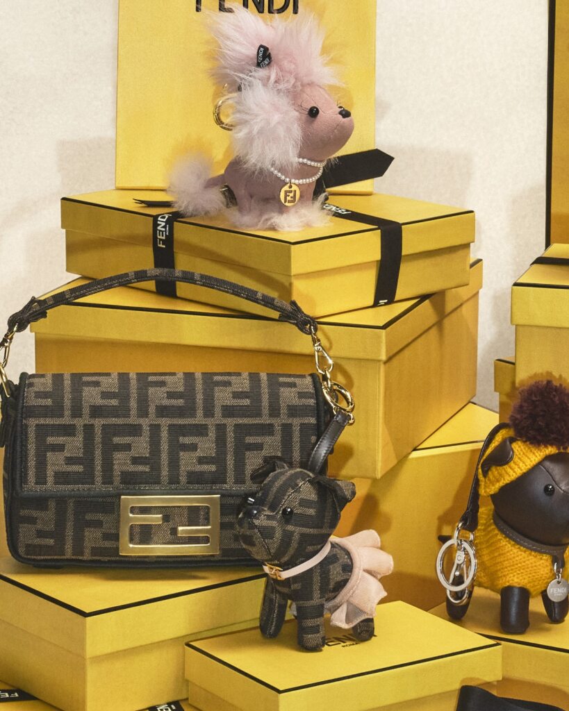 Para los puristas del estilo, el monograma FF regresa en su tejido clásico, acompañado de un toque lúdico que define esta temporada: los charms. Desde adorables figuras de perros tejidos con su propia indumentaria hasta muñecas de trapo con vestidos de lentejuelas, estos accesorios añaden una personalidad vibrante a cualquier bolso.