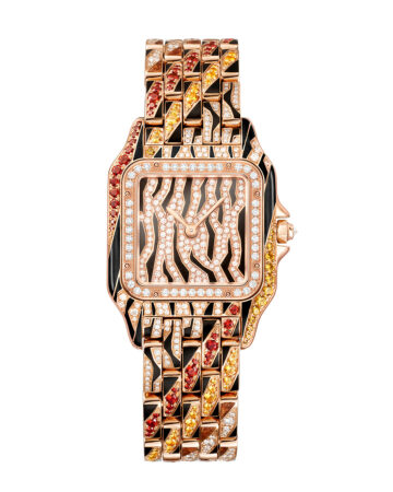 Otra versión del reloj Panthère representa un fabuloso pelaje abstracto, ¿cebra o tigre? Laca negra y marrón dorado, pavé de diamantes y espesartitas naranjas y amarillas. El trabajo minucioso del lacado y el montaje de precisión absoluta, 145 diamantes talla brillante culminan la pieza y reafirman la excelencia de los artesanos de la casa. ¿Cuál te gusta más?